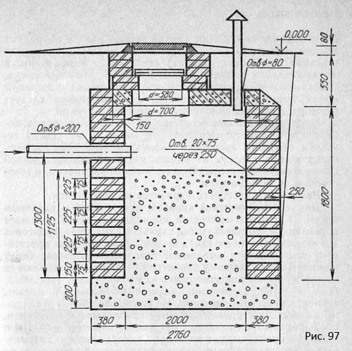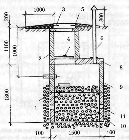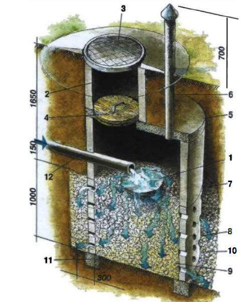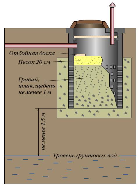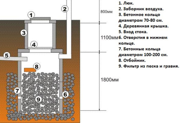 Le puits filtrant pour les égouts est constitué de briques cuites, de buta ou d'anneaux en béton armé. La base est disposée uniquement le long du périmètre du puits. À l'intérieur, ils disposent un filtre de fond en pierre concassée, gravier et autres matériaux jusqu'à 1 m de haut. À l'extérieur, autour du puits, un remblai est fait du même matériau que le filtre, de 40 à 50 cm de haut. Les murs du le puits doit avoir des trous disposés en damier (dans leurs anneaux, percez 10 cm de longueur et de hauteur; des trous sont faits dans les murs de brique et de pierre).
