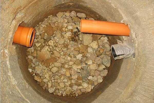 Au bas de l'ouvrage, une couche filtrante de pierre concassée ou de gravier est remblayée sur une hauteur d'un mètre. Dans ce cas, de grandes fractions du matériau sont placées en dessous, les petites - au-dessus. Le trou pour le tuyau à travers lequel s'écouleront les effluents de la fosse septique est fait de telle manière que l'eau coule dans un ruisseau d'une hauteur de 40 à 60 cm.