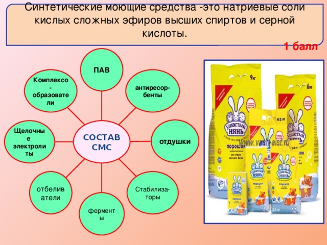 Par conséquent, de nombreux SMS se lavent aussi bien dans l'eau douce que dans l'eau dure ; les SMS agissent non seulement dans l'eau chaude, mais aussi dans l'eau chaude et froide, ce qui est important, par exemple, lors du lavage de tissus en fibres artificielles. Oui, et leur consommation est bien moindre par rapport à la consommation de savon (environ 25% du savon est utilisé pour lier les ions Ca2+ et Mg2+)