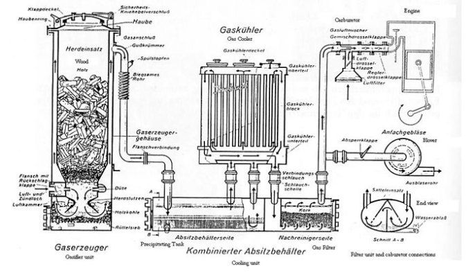 L'extraction de gaz à partir de bois de chauffage a été largement utilisée pendant la Seconde Guerre mondiale. Le combustible liquide est allé en première ligne, de nombreuses raffineries de pétrole détruites ont stimulé l'invention du gaz obtenu à partir du bois de chauffage.