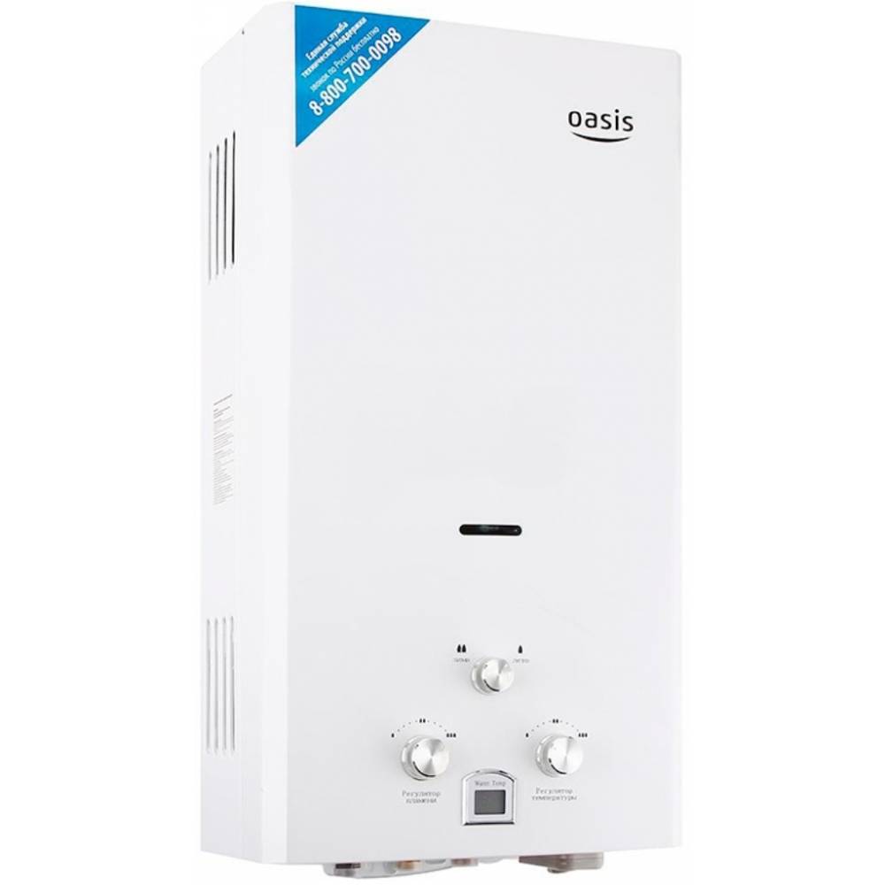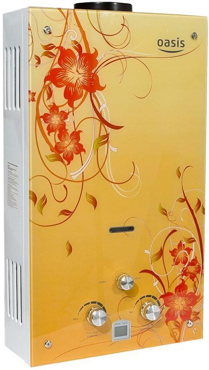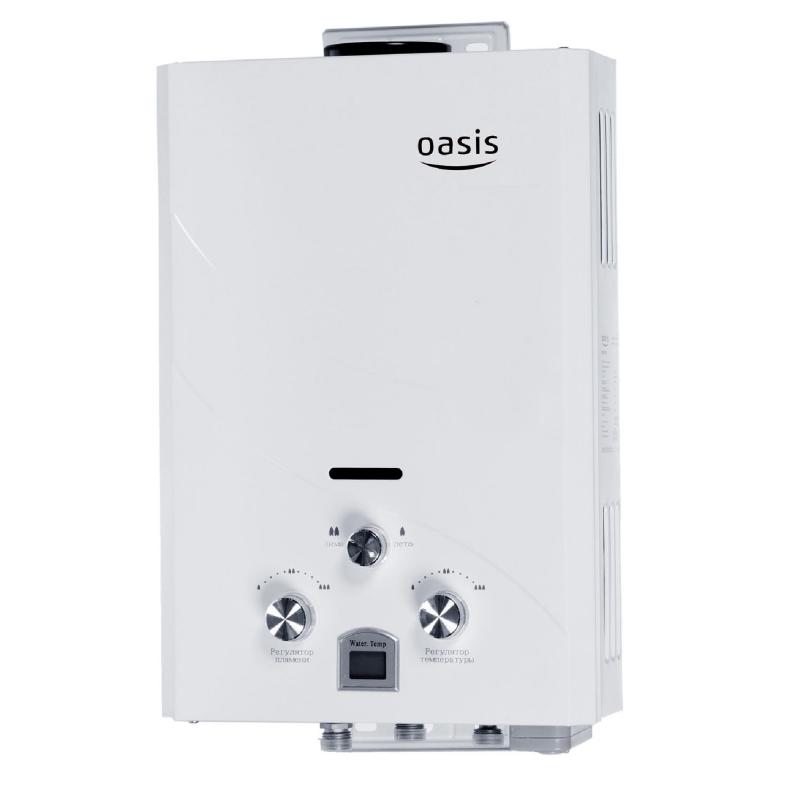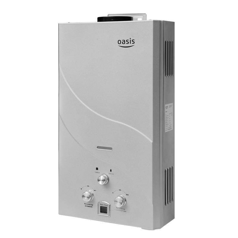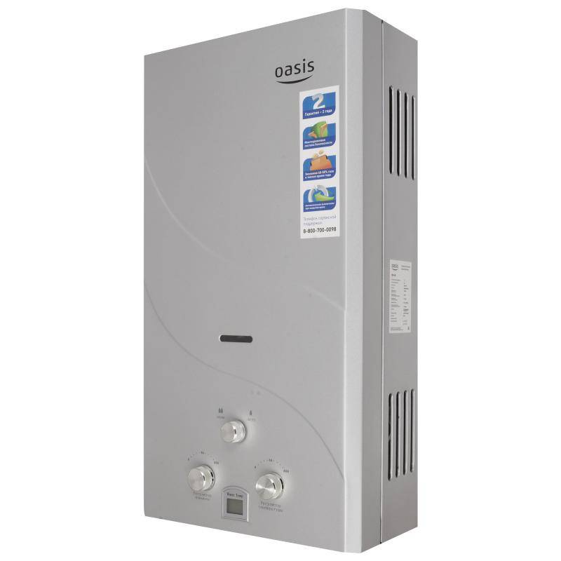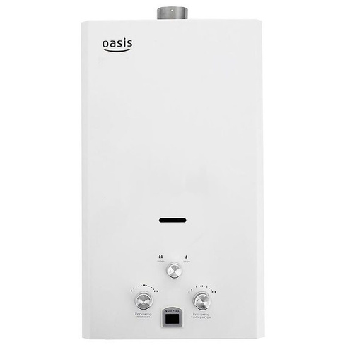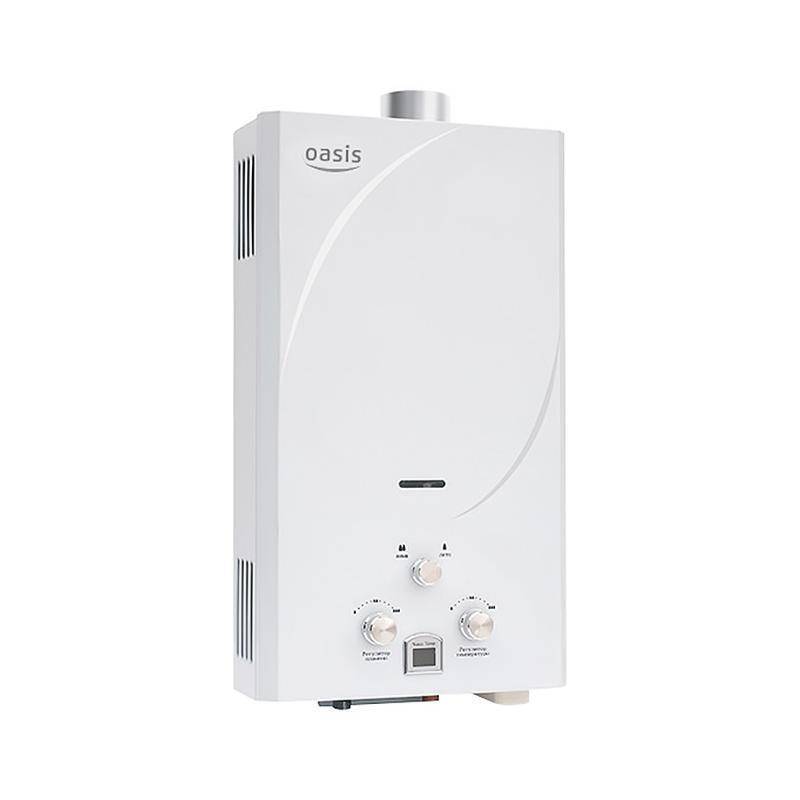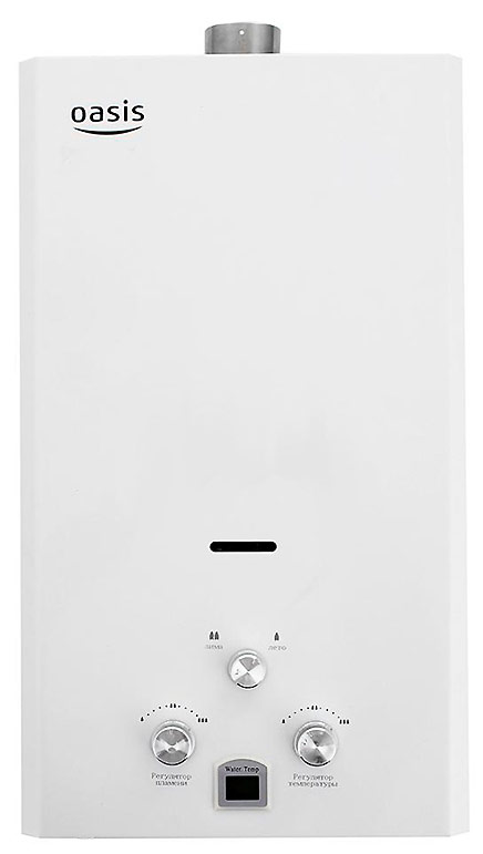 "Oasis B-12W" est un modèle miniature sans cheminée avec des dimensions de 29x37x12 cm et une capacité de 5 l / min. Il est généralement installé sur l'un des points d'admission, en raison de la puissance plutôt faible, ne dépassant pas 11 kW. L'allumage se fait à partir de batteries remplaçables. L'appareil est équipé d'un échangeur de chaleur en cuivre, d'une protection contre la surchauffe et d'un écran. Le coût de la colonne est de 4 000 roubles.