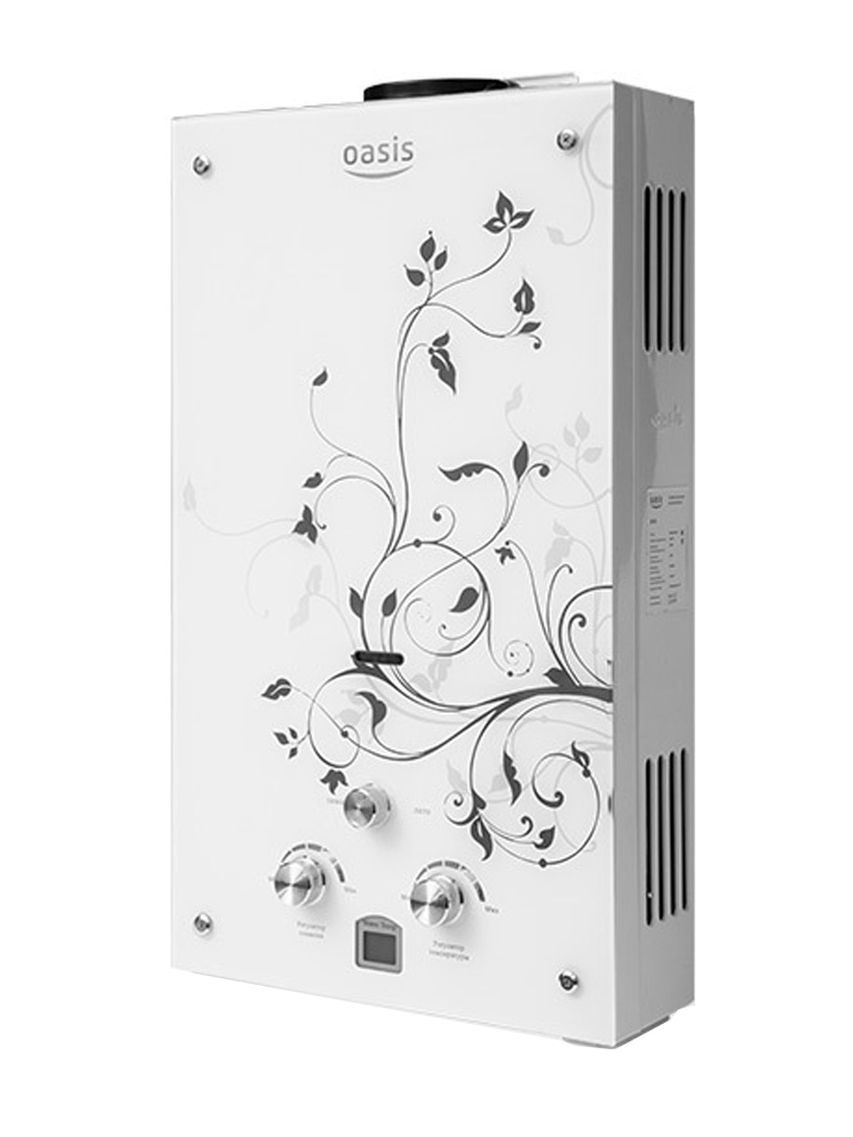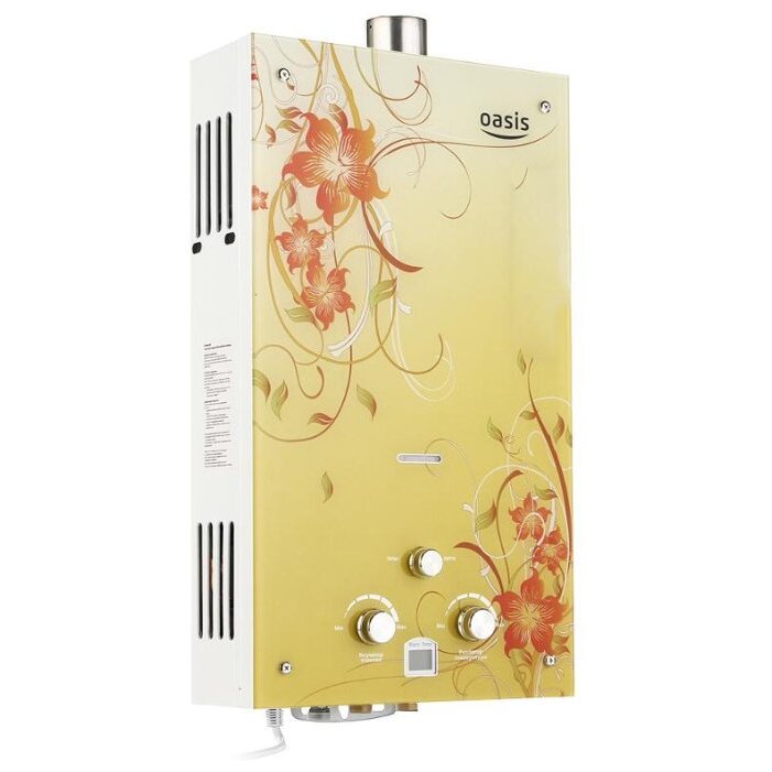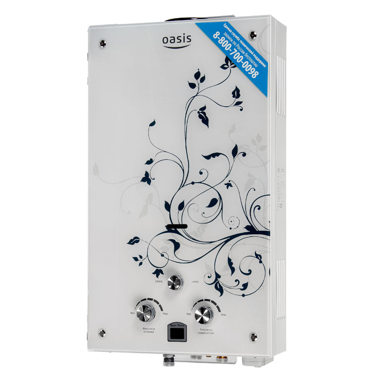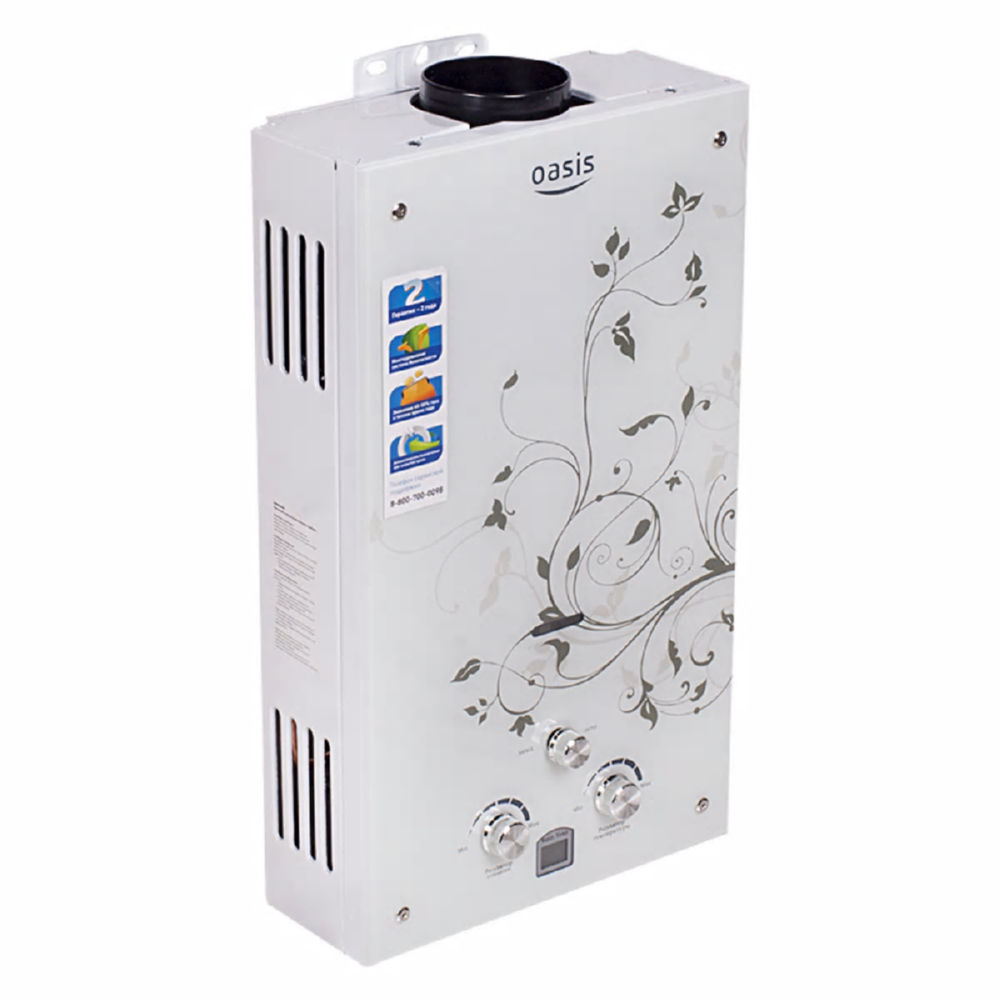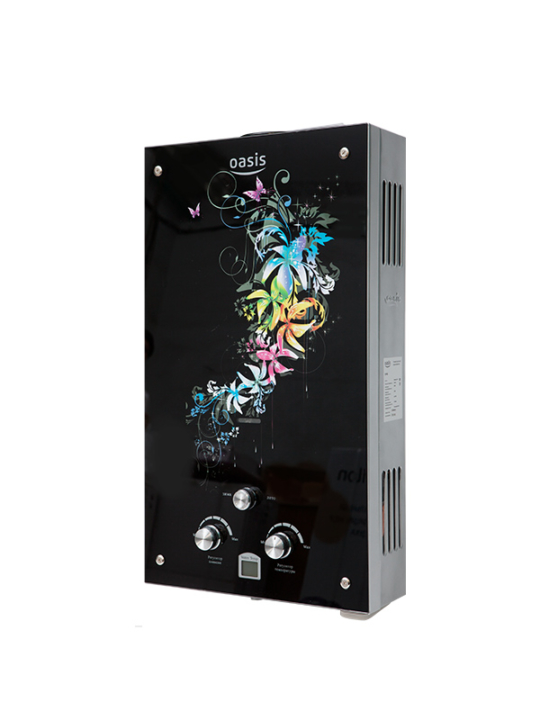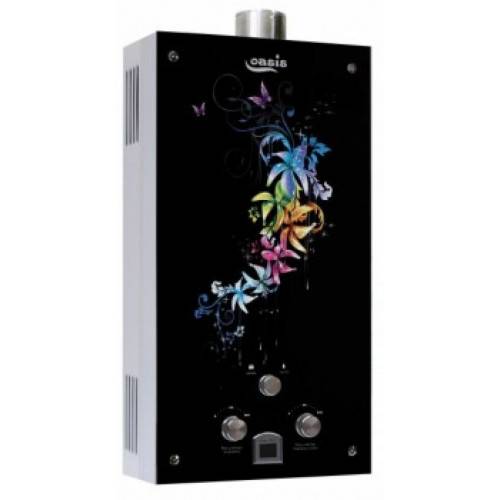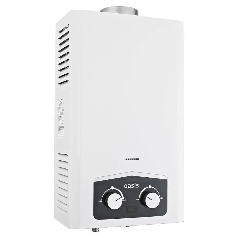 "Oasis B-12W" est un modèle miniature sans cheminée avec des dimensions de 29x37x12 cm et une capacité de 5 l / min. Il est généralement installé sur l'un des points d'admission, en raison de la puissance plutôt faible, ne dépassant pas 11 kW. L'allumage se fait à partir de batteries remplaçables. L'appareil est équipé d'un échangeur de chaleur en cuivre, d'une protection contre la surchauffe et d'un écran. Le coût de la colonne est de 4 000 roubles.