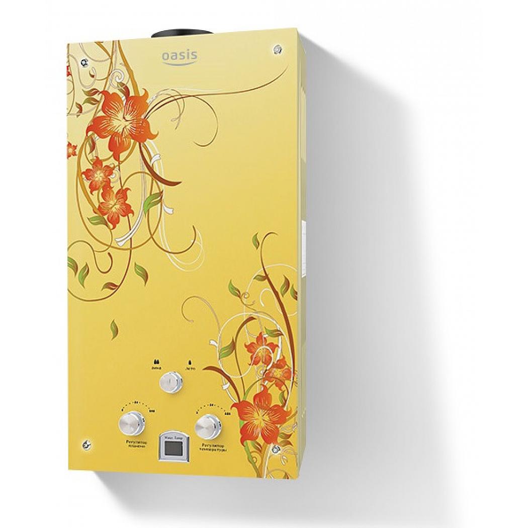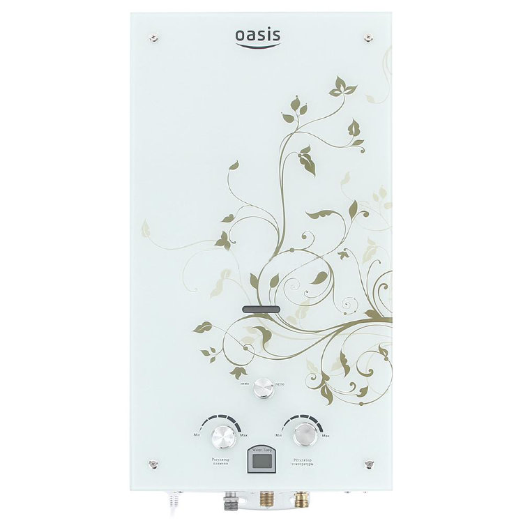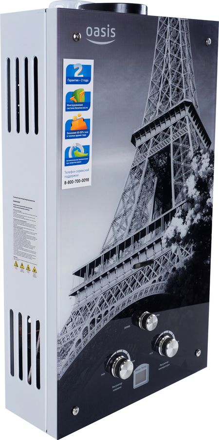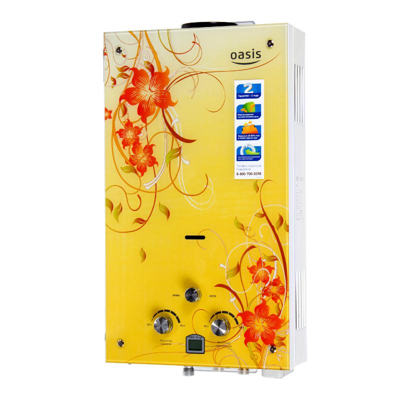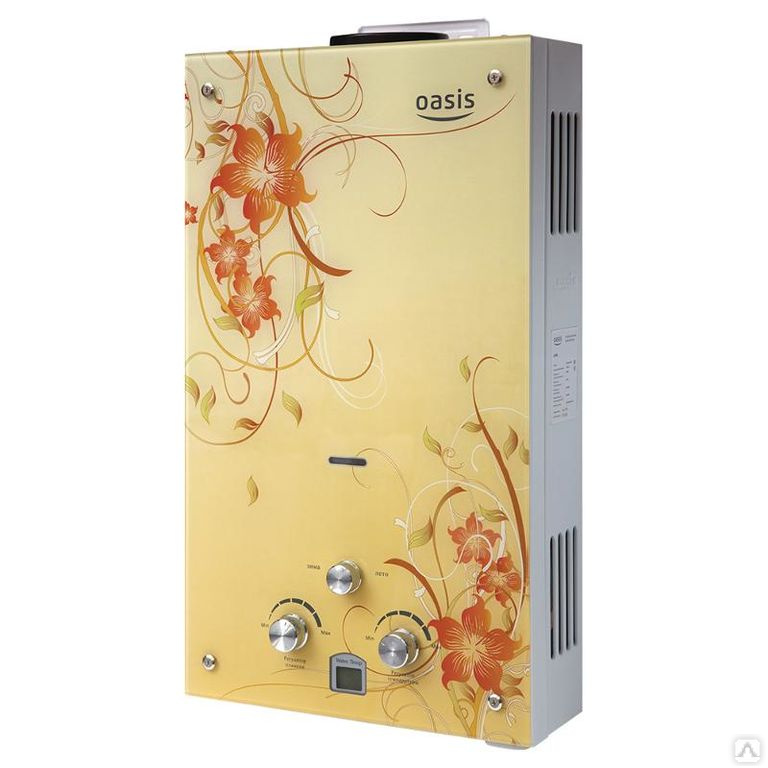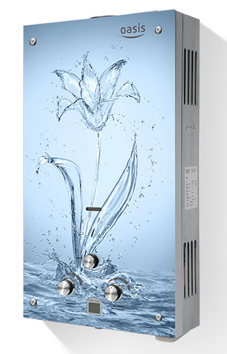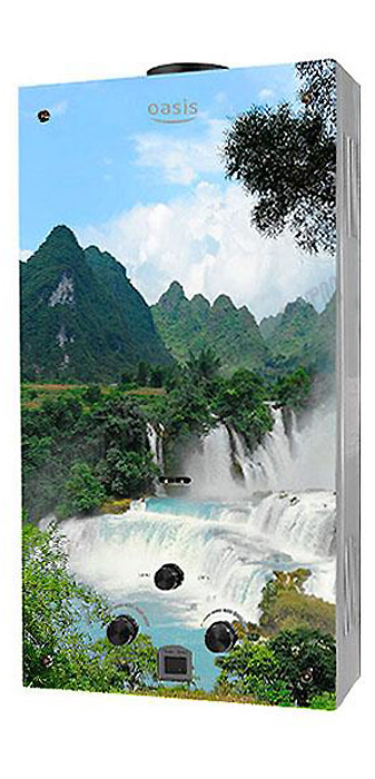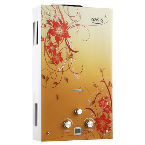 "Oasis B-12W" est un modèle miniature sans cheminée avec des dimensions de 29x37x12 cm et une capacité de 5 l / min. Il est généralement installé sur l'un des points d'admission, en raison de la puissance plutôt faible, ne dépassant pas 11 kW. L'allumage se fait à partir de batteries remplaçables. L'appareil est équipé d'un échangeur de chaleur en cuivre, d'une protection contre la surchauffe et d'un écran. Le coût de la colonne est de 4 000 roubles.