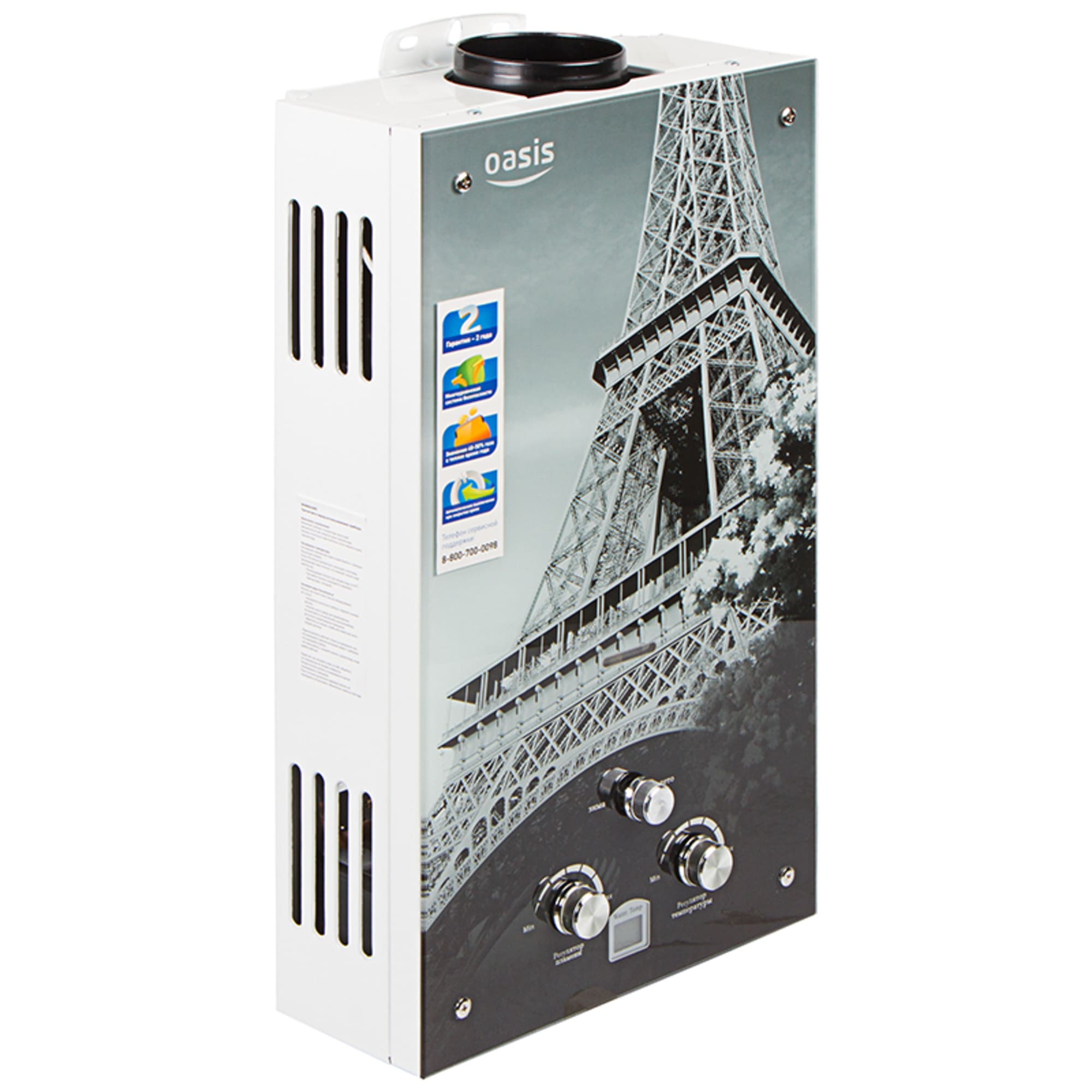 Oasis Glass 20 VG est un appareil à circulation qui nécessite une cheminée et qui a un design unique. En raison de ses petites dimensions, qui sont de 34x59x14,5 cm, la colonne s'intègre harmonieusement dans les petites pièces, n'encombre pas l'espace et ne gâche pas l'intérieur. Le modèle est alimenté par des batteries, ce qui assure une totale indépendance énergétique de l'appareil et rend son fonctionnement indépendant des coupures de courant. La colonne démarre automatiquement immédiatement après l'ouverture du robinet ECS à une pression dans les conduites d'eau d'au moins 0,02 MPa. La colonne est équipée d'un RCD, d'un thermostat et d'une fonction antigel, et la présence du mode Hiver-Été permet d'économiser jusqu'à 70 mètres cubes de gaz par an. Les performances du modèle sont de 10 l/min, ce qui, avec une puissance optimale de 20 kW, est suffisant pour la salle de bain et la cuisine. L'efficacité de l'appareil est de 90% et le coût varie de 4 à 4,8 mille roubles.