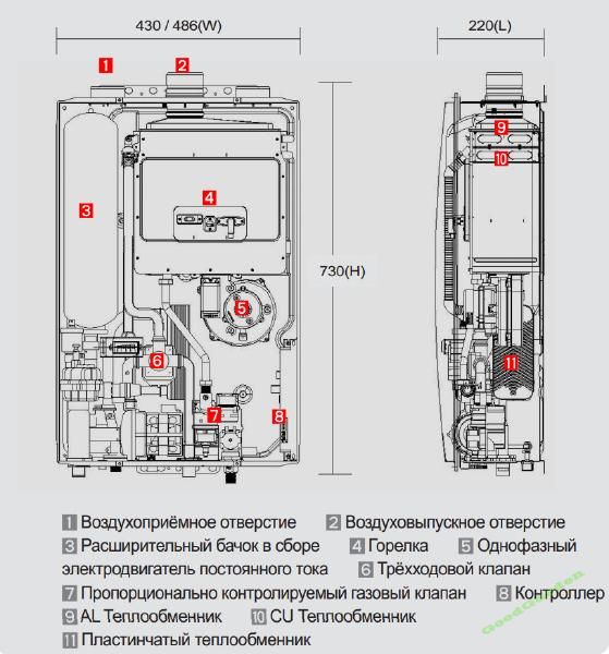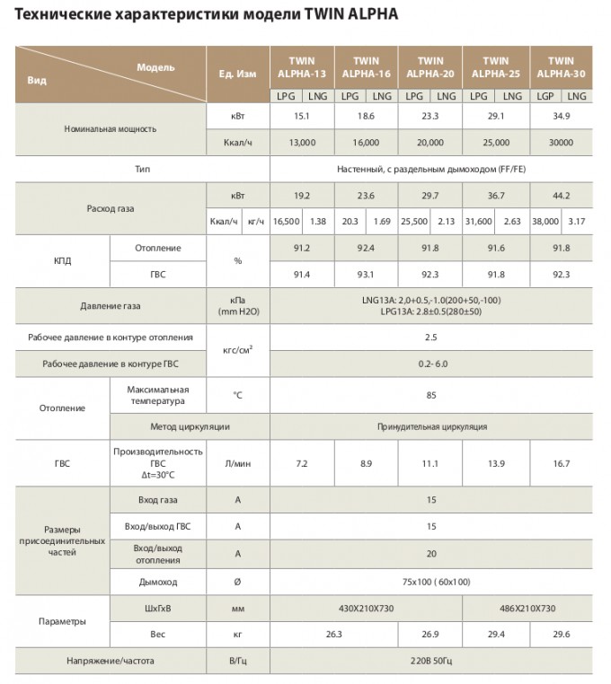 La chambre de combustion pour tous les modèles est fermée. La chaudière nécessite une cheminée coaxiale 75/100 mm ou 60/100 mm. Le vecteur énergétique peut être du gaz naturel ou liquéfié. La conception des chaudières de chauffage Kiturami de la série Twin alpha: