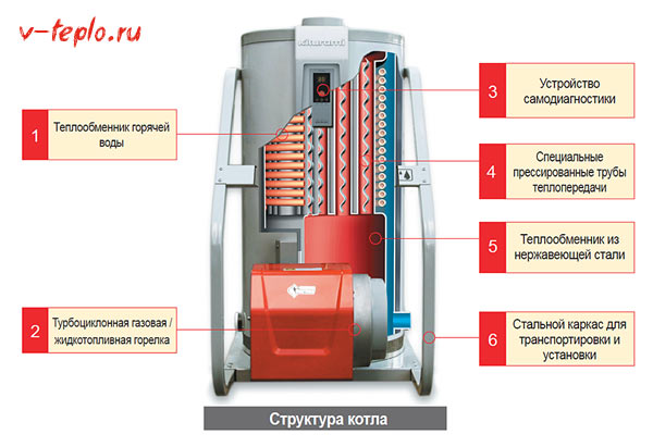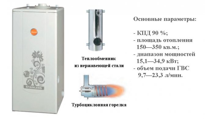 Le rendement moyen est de 92 %. La pression de travail en CO ne dépasse pas 2,5 atmosphères et dans le système ECS - jusqu'à 6 atmosphères. La température maximale du liquide de refroidissement est de 85 degrés. Le réchauffeur fonctionne uniquement dans des circuits à circulation forcée. Le coût varie entre 30 et 37 000 roubles. roubles selon la puissance.