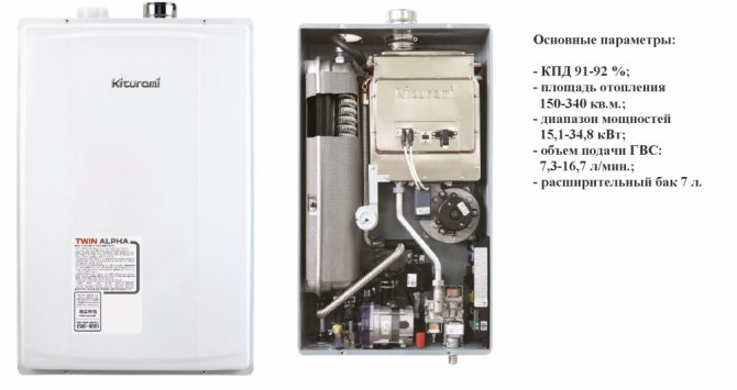 Selon les critiques, les chaudières à gaz Kiturami fonctionnent presque silencieusement. Les appareils sont équipés d'un système de protection contre les fuites de gaz et anti-coup de bélier, si le vent éteint la flamme, la chaudière redémarre automatiquement. La série Twin alpha est représentée par cinq appareils de chauffage de différentes capacités : 15, 19, 24, 29 et 35 kW (arrondis aux nombres entiers).L'échangeur de chaleur principal pour le chauffage est à circulation et pour l'eau chaude - à plaques.