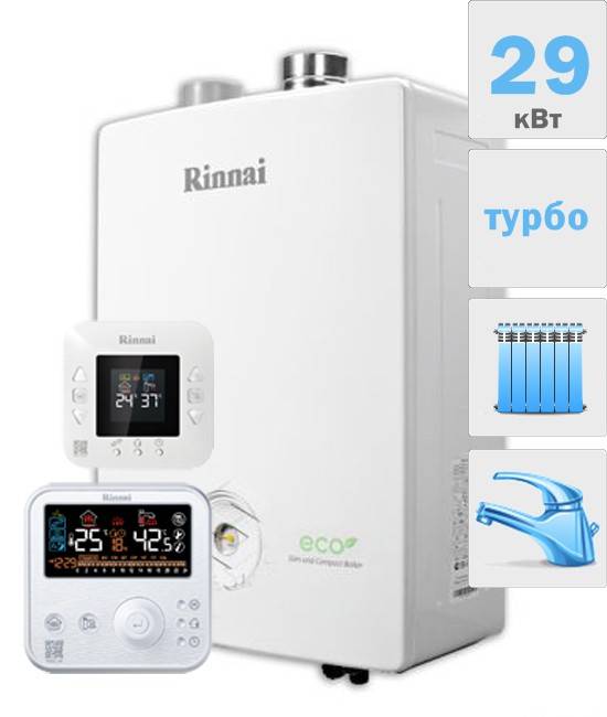 La puissance des unités peut être réduite de 20% lorsque le chauffage est allumé et la température du vecteur énergétique est contrôlée par un module électronique. La chaudière à gaz Rinnai fonctionne en mode de chauffage périodique et il y a toujours de l'eau chaude dans l'alimentation en eau. Le programme ECO de maîtrise écologique des travaux est mis en place. La série comprend les modèles 367, 257, 167, RB-107, 207,307.