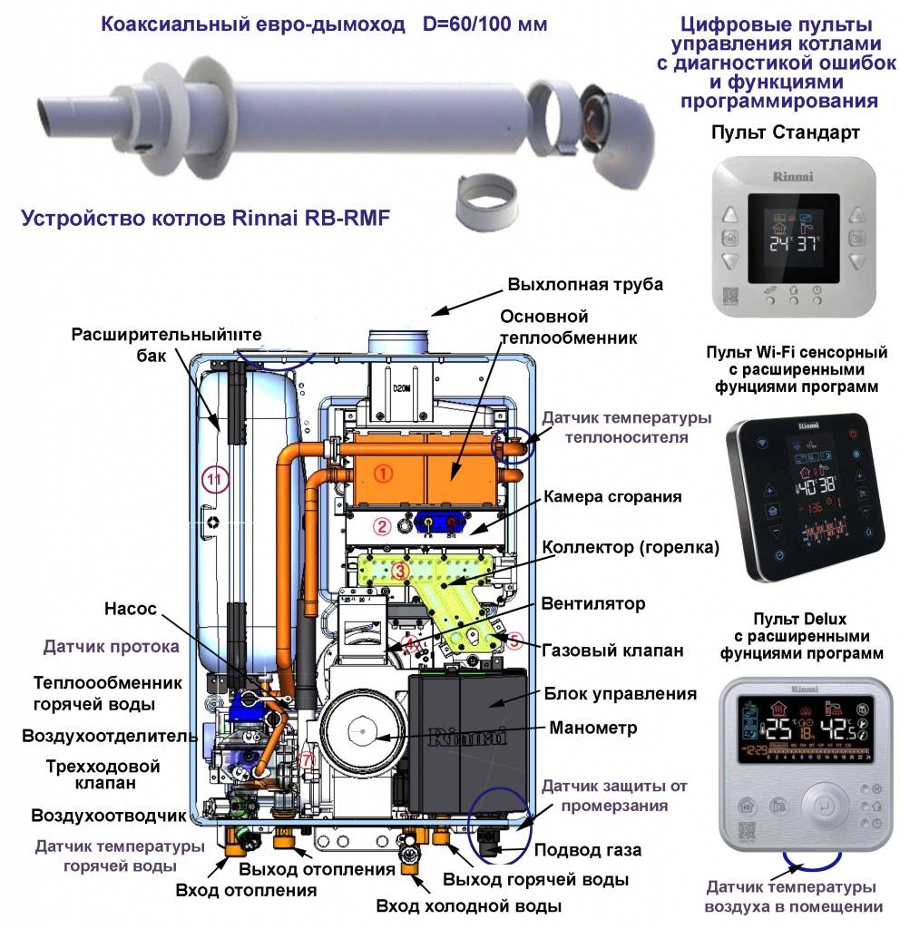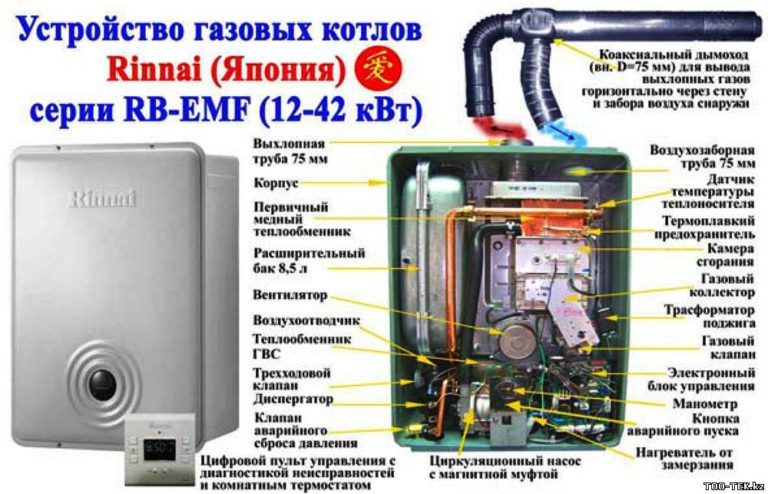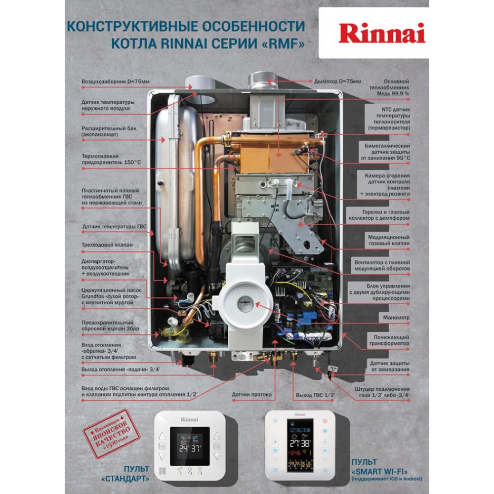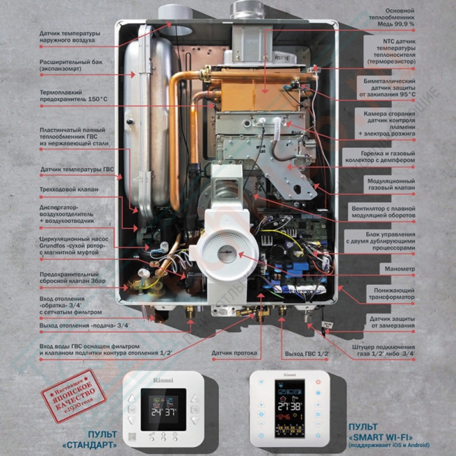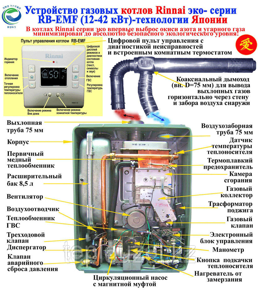 - Étant donné que toutes les chaudières à gaz Rinnai sont des unités murales à double circuit, les ingénieurs de l'entreprise ont développé des schémas et des dispositifs pour faire fonctionner l'appareil, ce qui a permis d'économiser 20 % de la consommation de gaz lorsque la chaudière a commuté l'alimentation en combustible sur le système ECS.