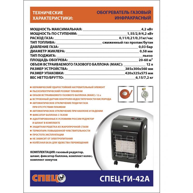 Le principe de fonctionnement de l'appareil est basé sur le rayonnement de l'énergie thermique. Une bouteille de gaz d'un volume de 27 litres est fixée dans sa partie inférieure. Des brûleurs sans flamme avec des émetteurs en céramique sont installés sur le dessus. Il y a un verrou en cas de basculement, d'extinction de flamme ou de fuite de gaz. L'appareil de chauffage fonctionne de manière stable à des températures ambiantes de -20 à +30o C. La zone de chauffage peut atteindre 20 m².