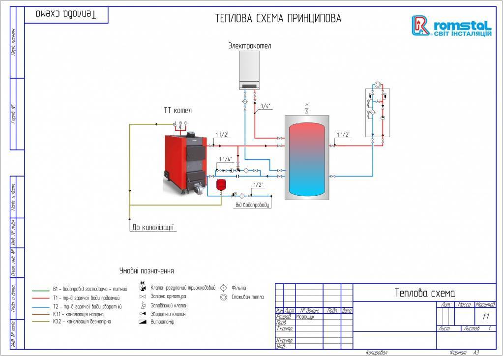 Le schéma canonique de raccordement d'une chaudière à combustible solide contient deux éléments principaux qui lui permettent de fonctionner de manière fiable dans le système de chauffage d'une maison privée. Il s'agit d'un groupe de sécurité et d'une unité de mélange basée sur une vanne à trois voies avec une tête thermique et un capteur de température, illustrés sur la figure :