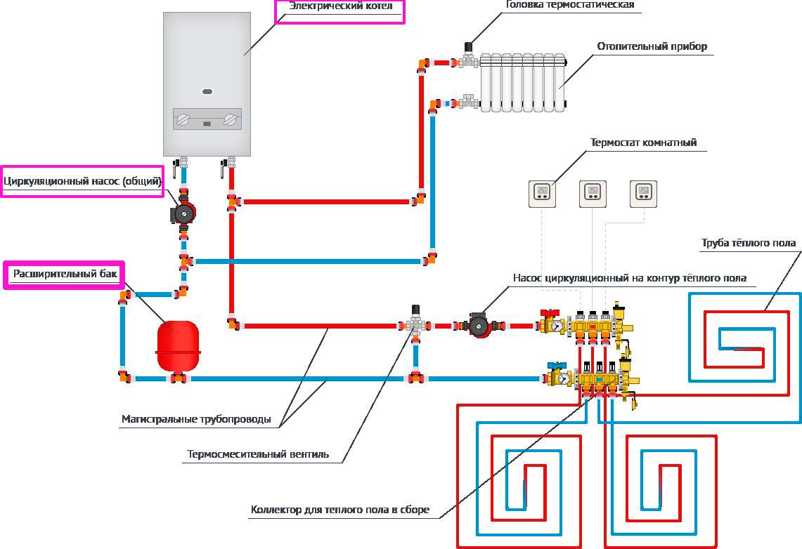 Si la structure de chauffage fonctionne à l'aide d'un radiateur électrique mural, tous ses éléments sont également inclus dans la tuyauterie, qui, en plus de l'alimentation en chaleur, peut assurer l'alimentation en eau chaude et le fonctionnement du système de chauffage «plancher chaud».