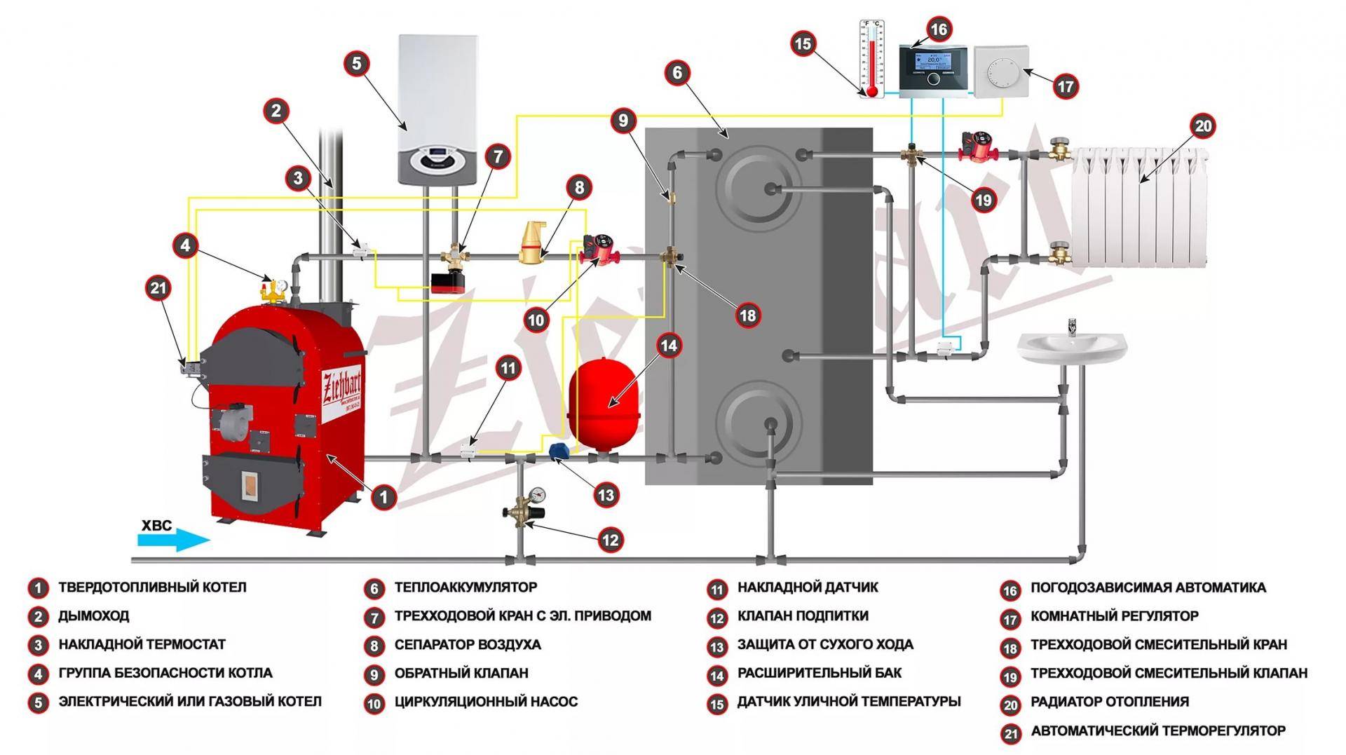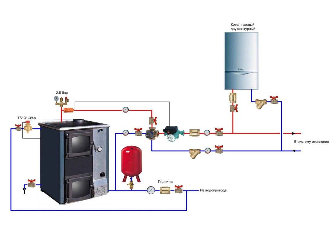 Important: un système fermé lors du raccordement de chaudières à gaz et à combustible solide est interdit et est considéré comme une violation grave de la sécurité incendie. Les performances optimales de deux chaudières peuvent être obtenues à l'aide d'un système de chauffage à plusieurs circuits, composé de deux circuits indépendants l'un de l'autre. Les performances optimales de deux chaudières peuvent être obtenues à l'aide d'un système de chauffage à plusieurs circuits, composé de deux circuits indépendants l'un de l'autre