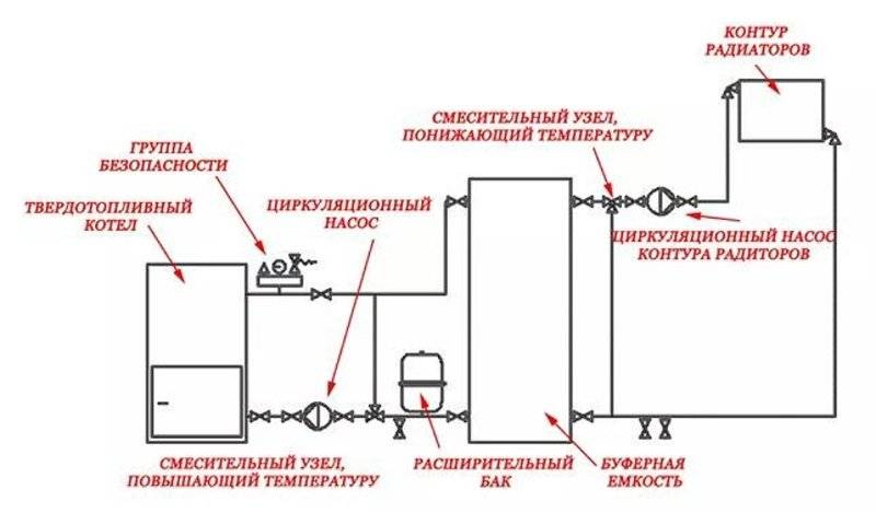 Ce schéma de tuyauterie est le plus simple et le plus fiable, vous pouvez l'installer vous-même en toute sécurité et ainsi assurer le fonctionnement en toute sécurité de la chaudière à combustible solide. À ce sujet, il existe quelques recommandations, en particulier lors de la fixation d'un poêle à bois dans une maison privée avec des tuyaux en polypropylène ou en polymère: