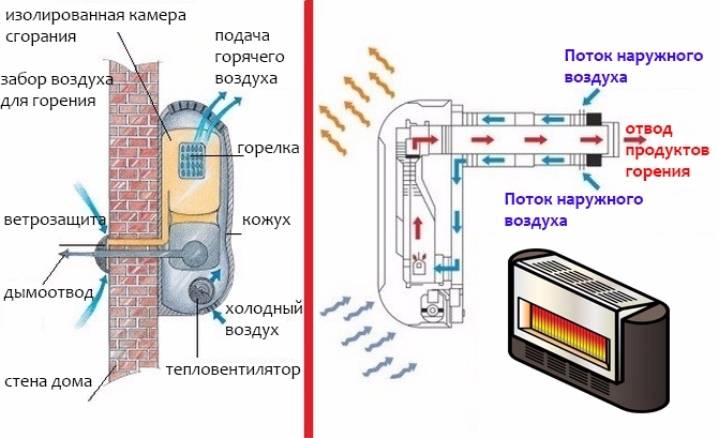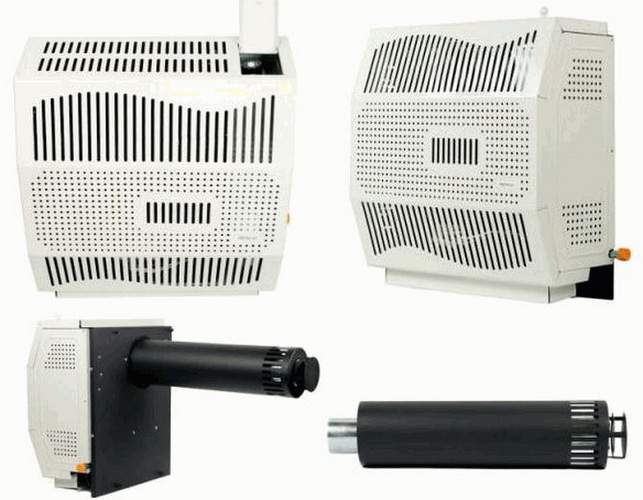 Le principe de fonctionnement de tels dispositifs est extrêmement simple. À l'aide d'un brûleur à gaz, l'échangeur de chaleur est chauffé, les masses d'air sont chauffées de manière naturelle ou forcée, en passant par un échangeur de chaleur chaud, puis montent en déplaçant l'air froid vers le bas.