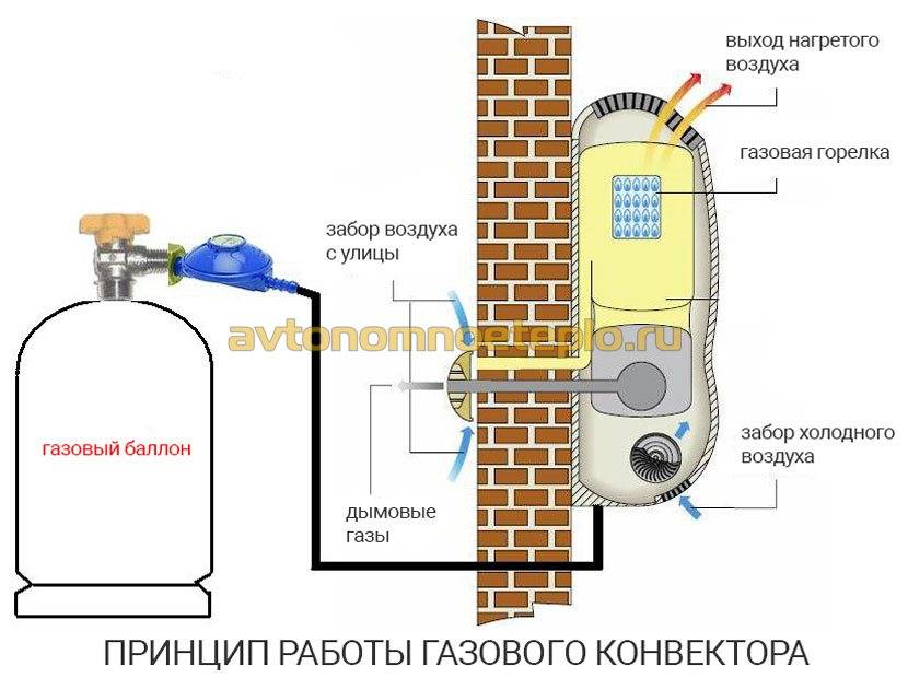 - Fonctionnement du convertisseur sur gaz liquéfié. Le convecteur à gaz est très facile à reconstruire pour l'équipement du ballon. Cela permet l'utilisation de ces appareils de chauffage dans les régions où il n'y a pas d'électricité ou où elle est alimentée avec quelques interruptions. Mais sur le plan économique, les convecteurs sur bouteille ou gaz liquéfié sont aussi économiquement imparfaits, ainsi que les équipements électriques.