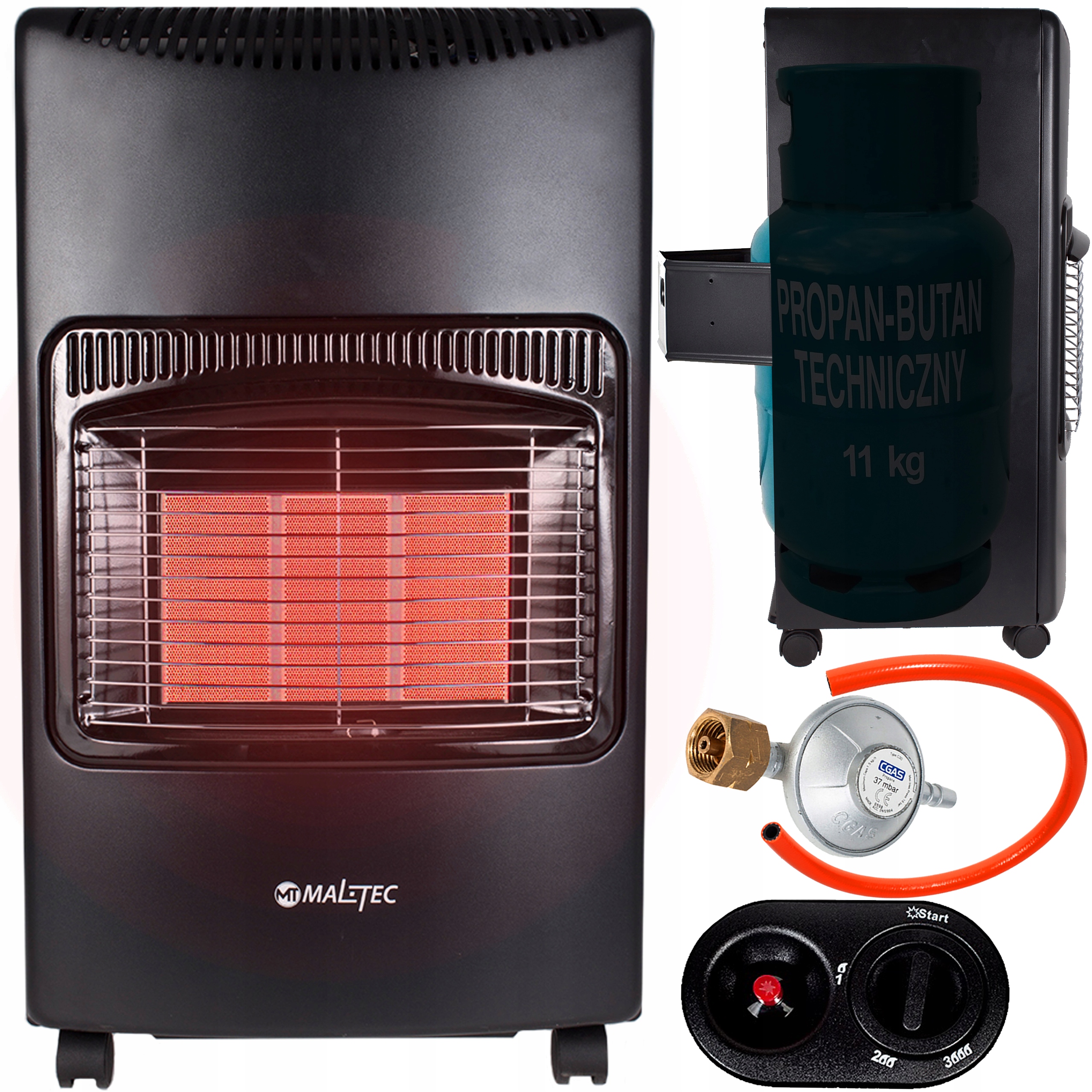 La cote est ouverte par le modèle Timberk, qui a une puissance minimale de 1,55 kW et maximale de 4,2 kW. Il est conçu pour chauffer une pièce jusqu'à 60 m². Carburant - propane, butane. Consommation de gaz - 0,31 kg / h. Une bouteille de gaz jusqu'à 15 kg peut tenir à l'intérieur de l'appareil (elle doit être achetée séparément). Trois niveaux de puissance de chauffage. Le chauffage a la fonction de chauffage infrarouge, système de contrôle du niveau de CO2, système de coupure en cas de retournement, contrôle des gaz et allumage piézo. La livraison comprend un réducteur et un tuyau de gaz. Tous les commutateurs sont situés en haut du boîtier, ce qui permet un accès rapide aux paramètres.