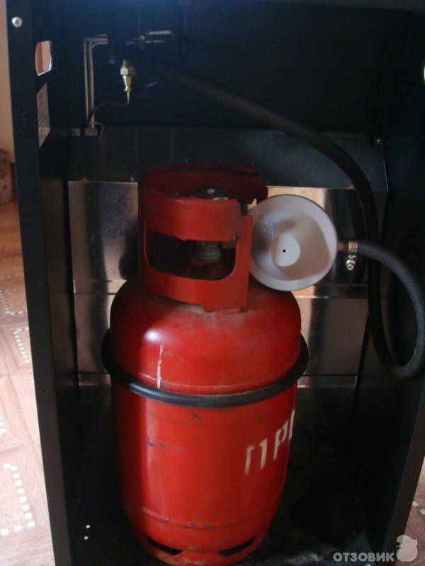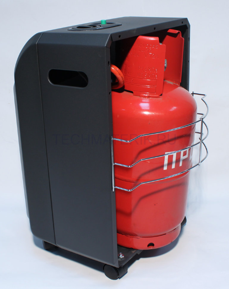 Pour un déplacement pratique, des roues sont fournies sur le corps. Malgré les dimensions compactes du boîtier, il y a de l'espace libre à l'intérieur pour une bouteille de gaz de 27 litres.