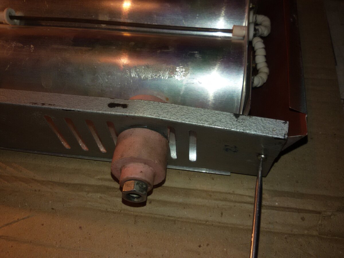 - Insérez les extrémités de la spirale nichrome dans les trous et soudez-les au câblage électrique dénudé. Pour la variabilité des modes et la fiabilité, plusieurs spirales sont connectées en parallèle et un régulateur de puissance est installé.