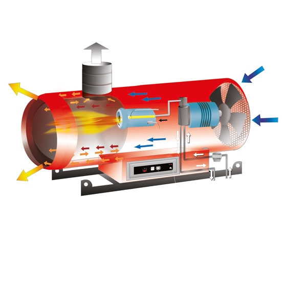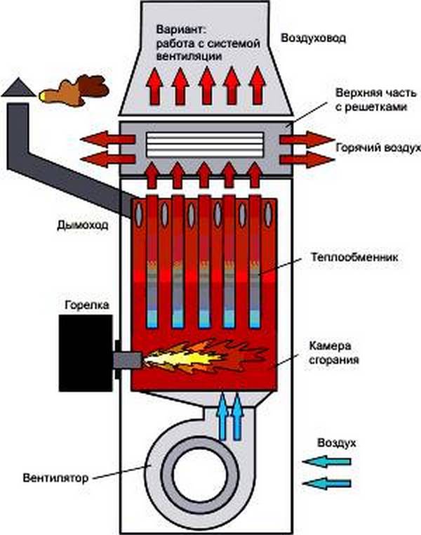 Le processus de fonctionnement des générateurs de chaleur air-gaz est très simple : l'air froid entre dans la chambre de combustion par un ventilateur, où il est chauffé par le gaz et un brûleur. Après cela, l'air déjà chauffé pénètre dans l'échangeur de chaleur, puis est distribué dans le système de conduits, puis pénètre dans la pièce à chauffer.