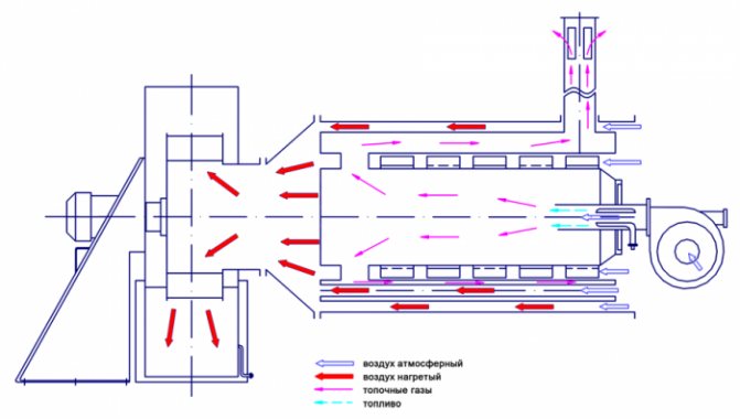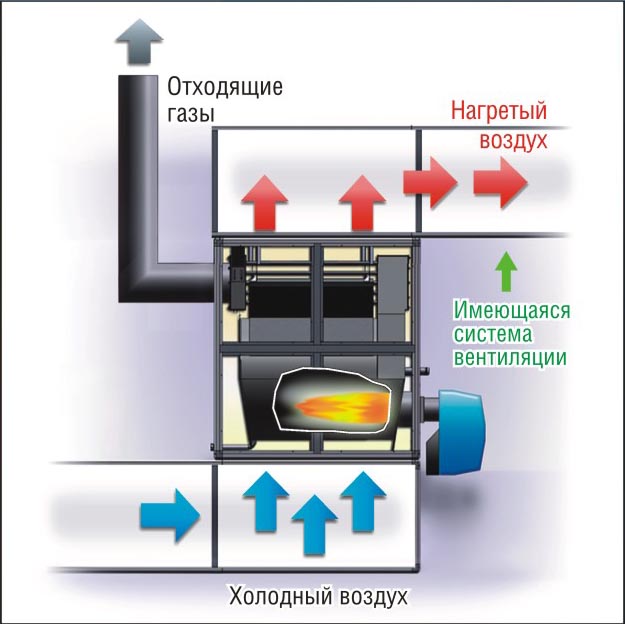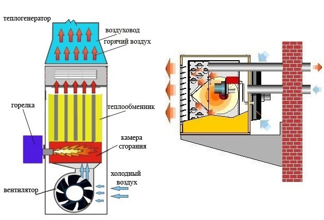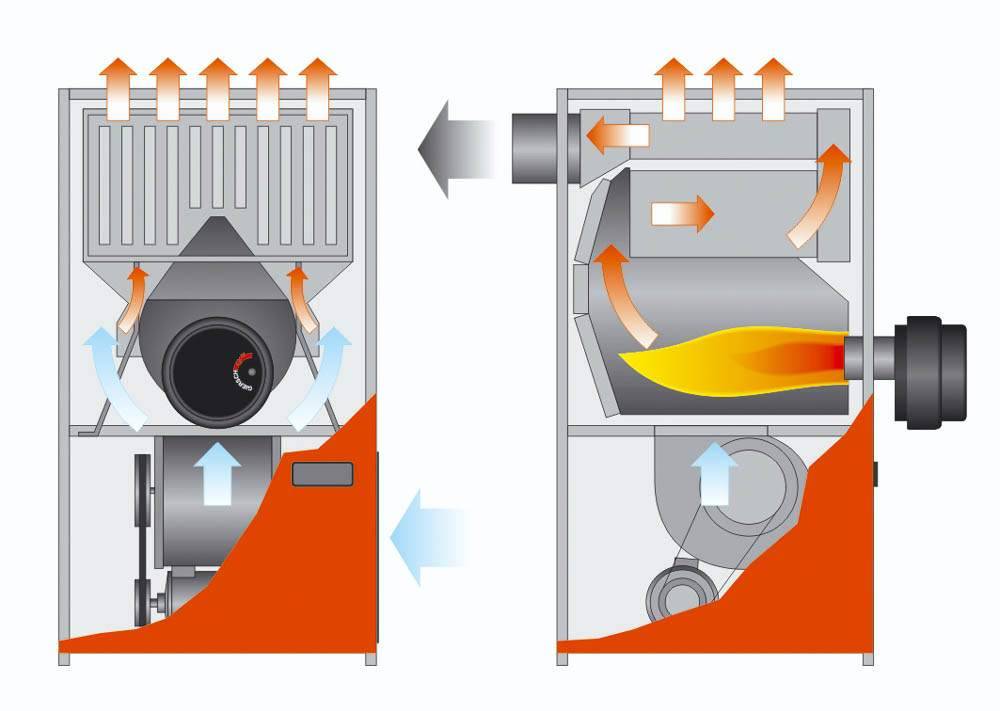 Le principe de fonctionnement d'un tel équipement de chauffage est le suivant: le ventilateur aspire de l'air froid dans l'appareil, il chauffe lors du processus de combustion du carburant à la température requise et est évacué par les conduits d'air dans la pièce.