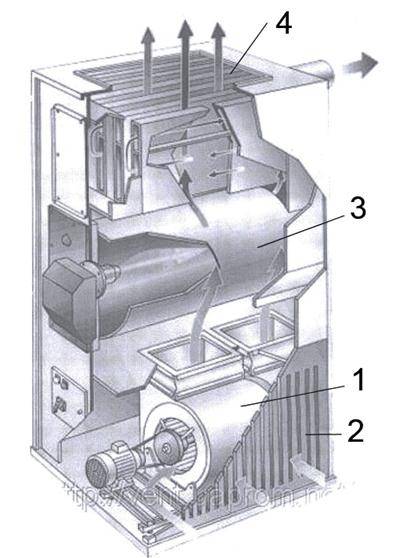 • après cela, le ventilateur fournit de l'air chauffé à l'échangeur de chaleur ;