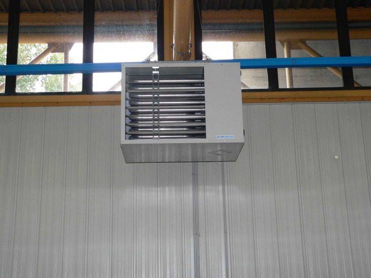 • De plus, le chauffage des bâtiments industriels est souvent conçu et installé dans un seul complexe avec des systèmes de climatisation. Cela permet de mettre en œuvre le chauffage de locaux industriels avec de grandes surfaces et en même temps d'économiser les ressources et l'espace occupé par le réseau. Tout d'abord, cette méthode est utilisée dans l'organisation du chauffage de l'air.