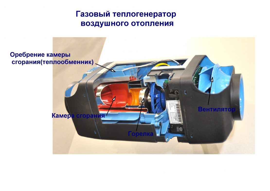 Dans un boîtier résistant à la chaleur (généralement en acier) de tels appareils, un ventilateur, un brûleur et une chambre de combustion sont placés.