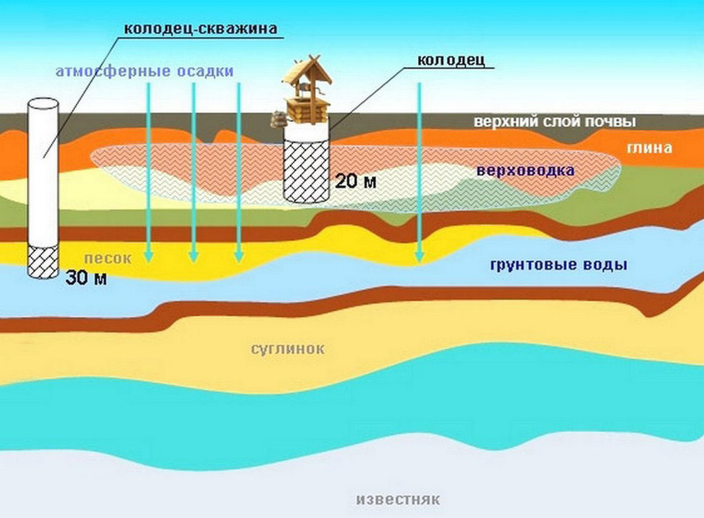 - Verkhovodka est l'aquifère supérieur, situé à une profondeur allant jusqu'à 3-4 m, rempli d'eau de fonte et de pluie, il se caractérise donc par un degré élevé de pollution. Il est interdit d'utiliser cette eau pour boire et abreuver les animaux domestiques, cette eau peut être utilisée pour l'arrosage des plantes. Pendant la période de sécheresse et d'hiver, l'eau perchée peut tout simplement disparaître, de sorte que le forage d'un puits n'est jamais effectué avant eux.