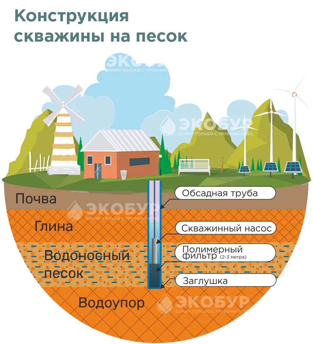 Au fur et à mesure que le puits passe, des tiges supplémentaires sont installées jusqu'à ce que l'aquifère soit ouvert. Une fois le forage terminé, un filtre avec des tubes de tubage est inséré dans le puits, qui sont filetés et prolongés jusqu'à ce que le filtre pénètre dans l'aquifère. Ensuite, un câble avec une pompe submersible avec un tuyau et un entraînement électrique est abaissé. L'eau est pompée jusqu'à ce qu'elle soit transparente. L'adaptateur relie la source à l'alimentation en eau.