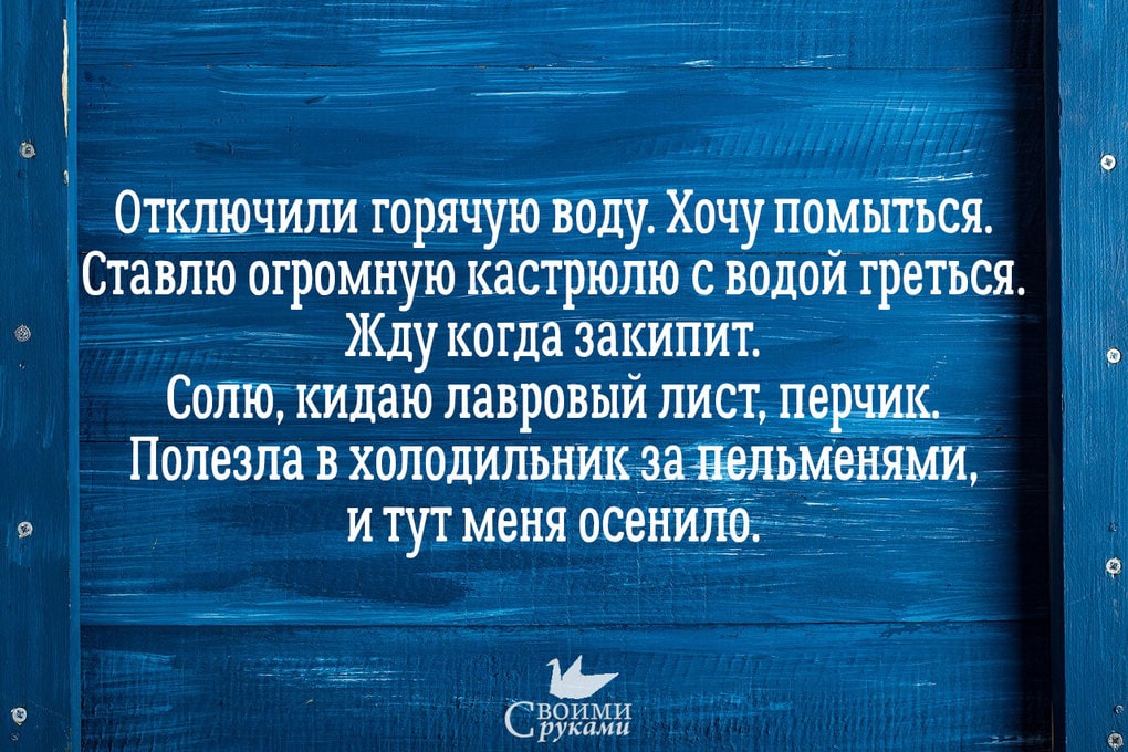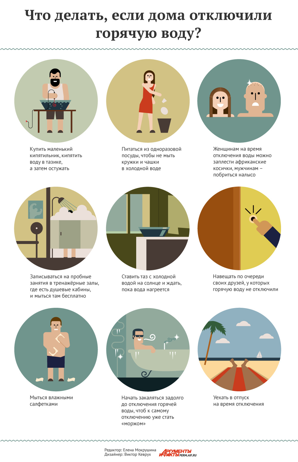 L'eau chaude, comme vous le savez, est coupée au moment le plus inopportun, malgré le fait qu'en règle générale, ils en avertissent à l'avance - ils publient des annonces dans les entrées, publient un horaire sur le site officiel du Moscou Maire. L'été, les longues promenades dans la ville, le vélo et bien plus encore provoquent une irrésistible envie de se laver. Mais il n'y a rien à faire, il faut s'adapter. Alors que certains recourent aux bouilloires et bassines pour se laver, tandis que d'autres prennent d'assaut les appartements d'amis, "VM" propose d'aborder la question de manière plus originale. Au final, ces 10 jours les plus durs de l'été devraient aussi se passer avec humour.