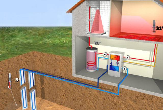 Le fonctionnement des centrales de chauffage géothermiques est souvent comparé au principe de fonctionnement des systèmes de climatisation ou d'un réfrigérateur conventionnel. Chacun des schémas consiste en deux circuits d'échange de chaleur. Il est généralement admis que dans le circuit situé dans le sol, le porteur est chauffé (le plus souvent le fréon non gelant joue ce rôle), qui est ensuite transféré au «circuit domestique» dans l'évaporateur de l'échangeur de chaleur.