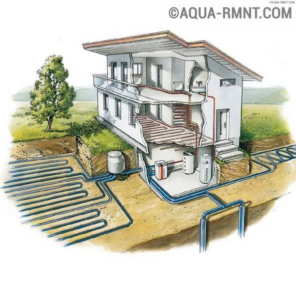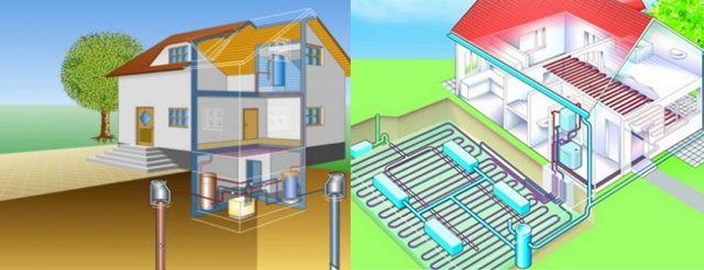 Une partie du système a un emplacement souterrain, grâce auquel la terre est utilisée comme source de chaleur. Un chauffage de ce type nécessitera un puits, une sonde et un échangeur de chaleur. Seul un appareil est installé sur le territoire de la maison, grâce auquel de la chaleur est générée et, en règle générale, il ne nécessite pas trop d'espace. Grâce à cet appareil, la température est régulée et l'énergie thermique est fournie. Lors de l'installation du système, une petite ramification de tuyaux et un radiateur sont nécessaires, et si le bâtiment est petit, le générateur est installé au sous-sol.