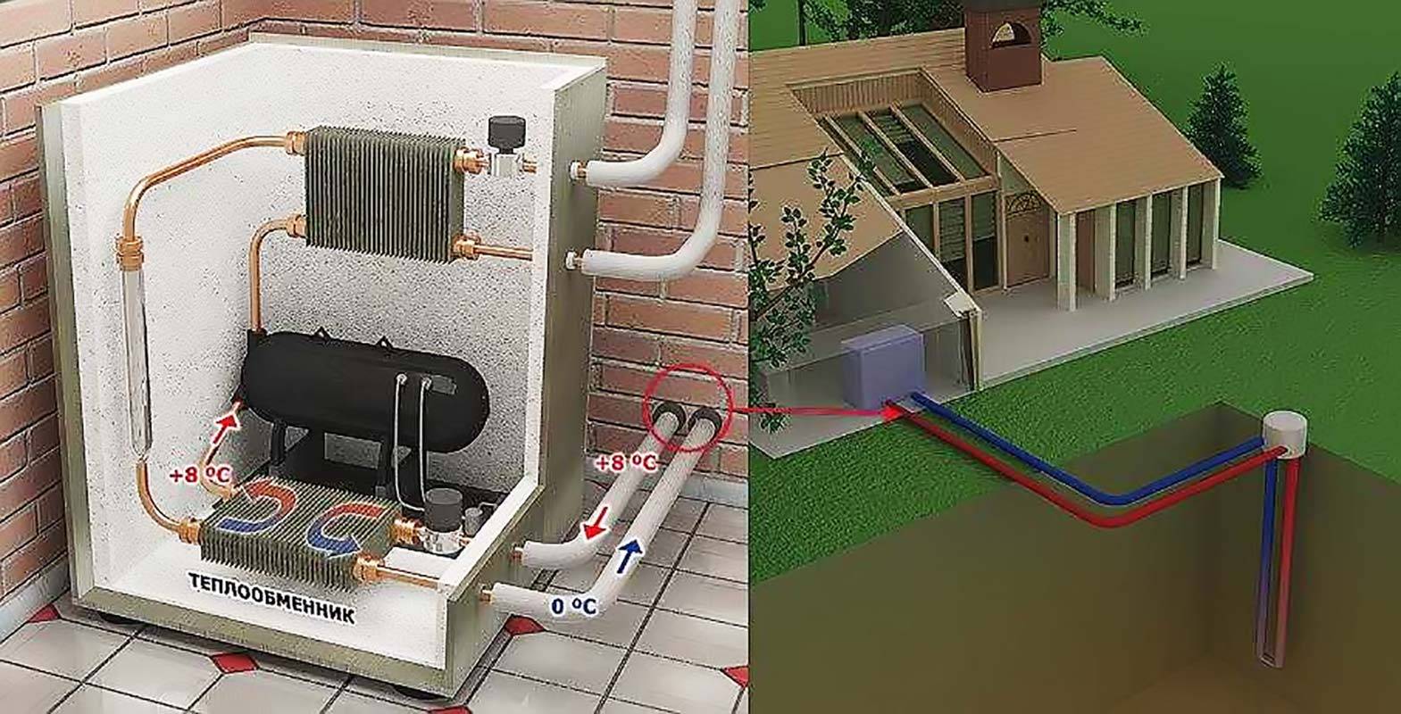 Le liquide de refroidissement passe par des tuyaux qui sont enterrés, par exemple, dans le sol. Ensuite, le liquide de refroidissement entre dans l'échangeur de chaleur, où l'énergie thermique collectée est transférée au deuxième circuit. Le réfrigérant, qui se trouve dans le circuit externe, chauffe et se transforme en gaz.Après cela, le réfrigérant gazeux passe dans le compresseur, où il est comprimé. Cela fait chauffer encore plus le réfrigérant. Le gaz chaud va au condenseur, et là la chaleur passe au liquide de refroidissement, qui chauffe déjà la maison elle-même.