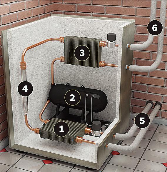 L'élément principal du système est précisément la pompe à chaleur - un appareil qui ne prend pas plus de place qu'une cuisinière à gaz. Les performances de la pompe à chaleur sont assez élevées : pour chaque kilowatt d'énergie utilisée, elle produit jusqu'à cinq kilowatts de chaleur.