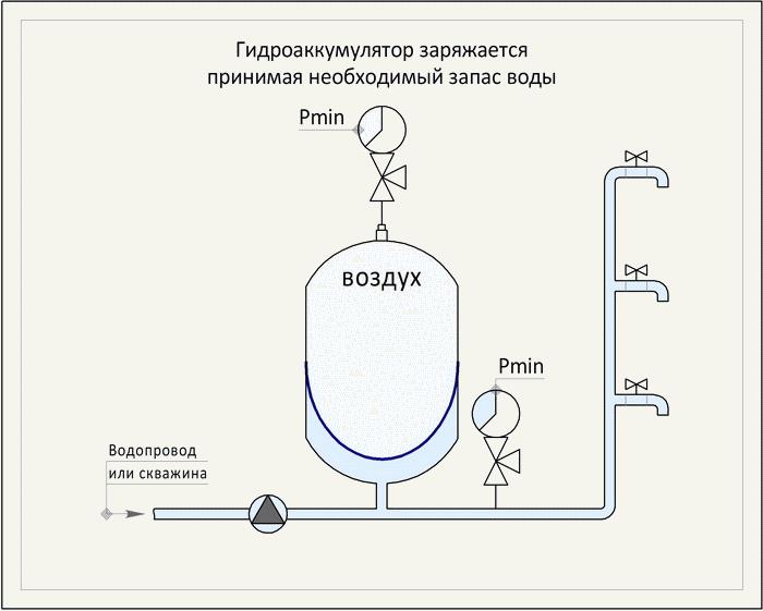 Par exemple, si la pompe est située au sous-sol, il y a un accumulateur hydraulique à côté et le second est dans le grenier, alors vous pouvez voir que le volume d'eau sur le réservoir hydraulique situé dans la partie supérieure du maison sera moindre, puisque la pression de l'eau du système sera moindre. Lorsqu'un accumulateur hydraulique est situé au sous-sol ou au premier étage, le niveau de remplissage sera le même.