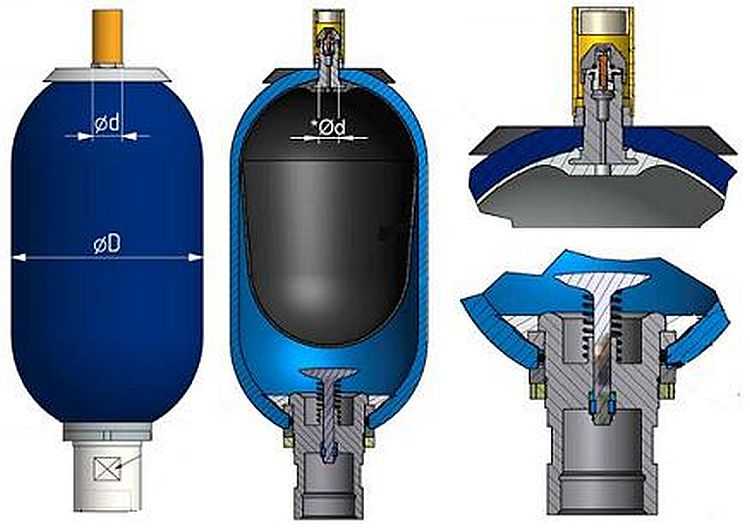Le dispositif d'un accumulateur hydraulique standard à membrane remplaçable (le type le plus courant) est assez simple. À l'intérieur de l'accumulateur se trouve une membrane élastique de forme sphérique ou en forme de poire.