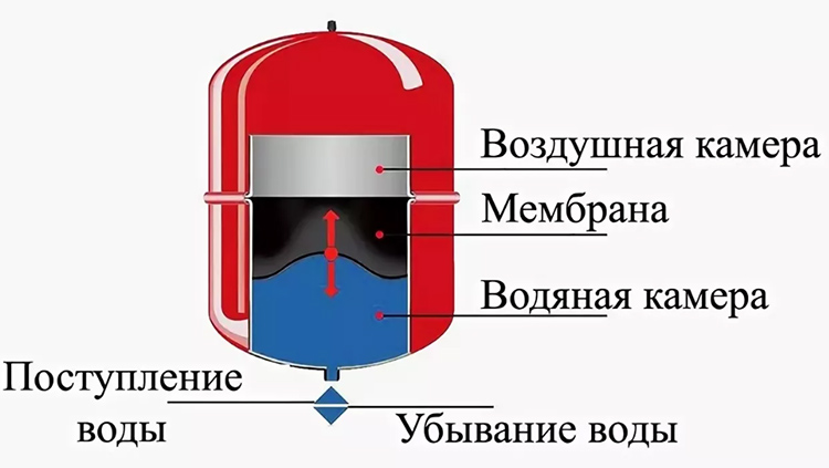 En mode de fonctionnement, il y a de l'eau à l'intérieur de la membrane, et entre les parois du réservoir et la membrane il y a de l'air pré-pressurisé ou un autre gaz (la valeur de pré-injection est indiquée sur l'étiquette). Ainsi, l'eau n'entre pas en contact avec les parois de l'accumulateur, mais uniquement avec la membrane, qui est réalisée dans un matériau adapté au contact avec l'eau potable.