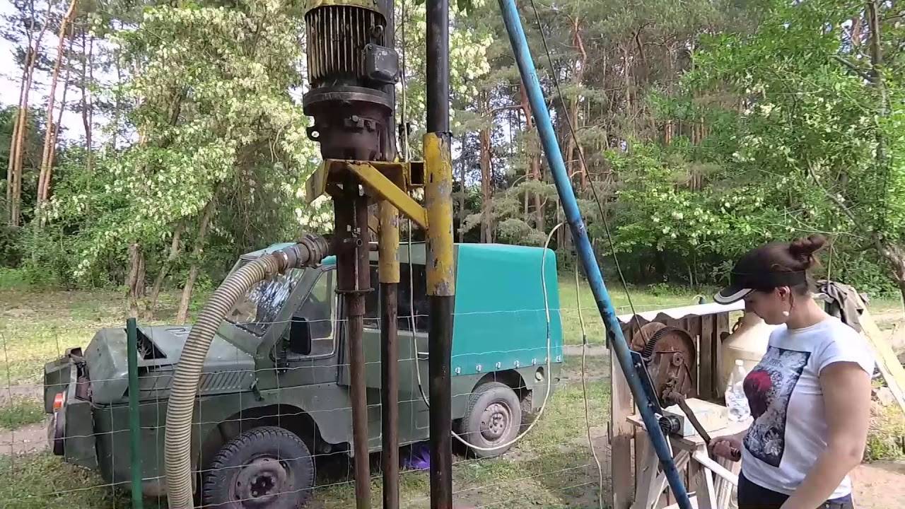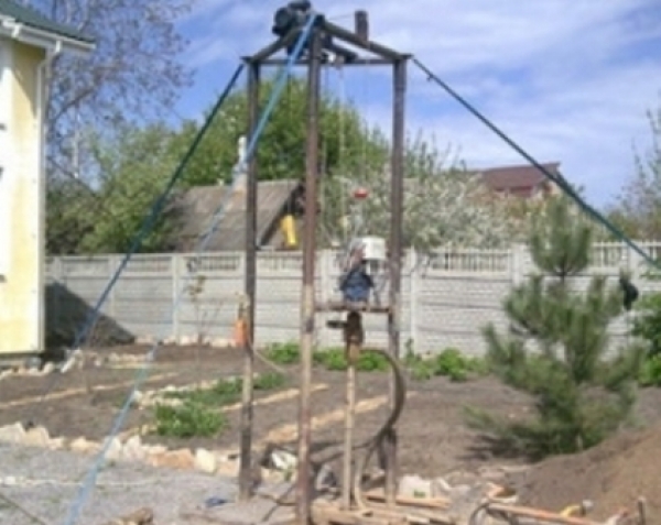 Il n'y a pas d'arbre, que ce soit une bûche, sur laquelle le câble peut être fixé au milieu. Maintenant que la perceuse a été retirée, il reste très peu - pour rincer le puits avec de l'eau propre, pour laquelle une pompe est utile et oscillante.