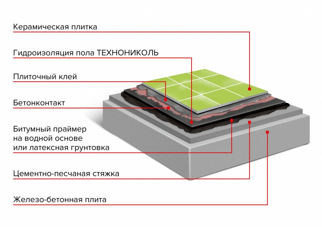 De nombreuses méthodes d'imperméabilisation des sols ont un objectif commun - la création d'un revêtement continu, en forme de palette avec des côtés de 10 à 20 cm sur les murs. Une sorte de récipient fabriqué par cette méthode recueillera le condensat qui coule le long des murs dans les ruisseaux, l'eau renversée et éclaboussée. Une couche d'étanchéité monolithique ne laissera pas entrer l'humidité dans le plafond, empêchera la destruction de la base. En même temps, il se débarrassera de la pourriture, de la réinstallation des champignons et des odeurs nocives émises par ces représentants désagréables de la biosphère.