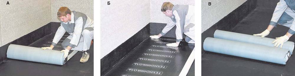 Ensuite, un rouleau est enroulé dessus et pressé avec un rouleau à main. Si des bulles d'air se forment sous le matériau, elles sont percées avec un poinçon et, en appuyant sur la base, relâchez-les. Les rouleaux sont collés avec un chevauchement de 10 cm.Le dessus de l'imperméabilisation est recouvert d'une chape de ciment.