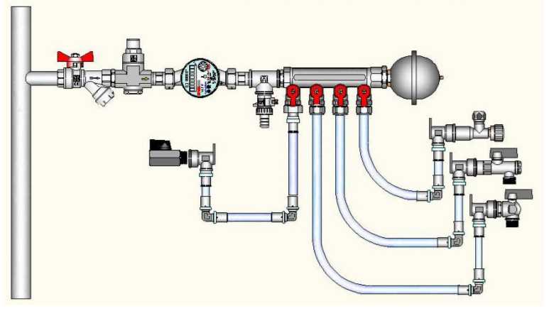 Schéma d'installation Après le compteur d'eau, installez un filtre autonettoyant, puis un réducteur. Après cela vient le collecteur, et au bout du collecteur se trouve un amortisseur hydraulique.