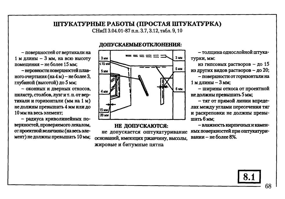 | Déviation des pentes des fenêtres et des portes, des pilastres, des piliers, etc. de la verticale à l'horizontale | Pas plus de 4 mm par 1 m, mais pas plus de 10 mm pour l'ensemble de l'élément | Sur la zone 4 pas plus de 4 mm par 1 m, mais pas plus de 10 mm pour l'ensemble de l'élément | Sur la zone 4 pas plus de 2 mm par 1 m, mais pas plus de 5 mm pour l'ensemble de l'élément |