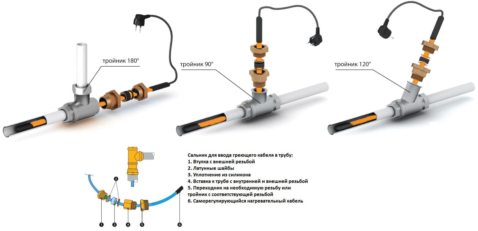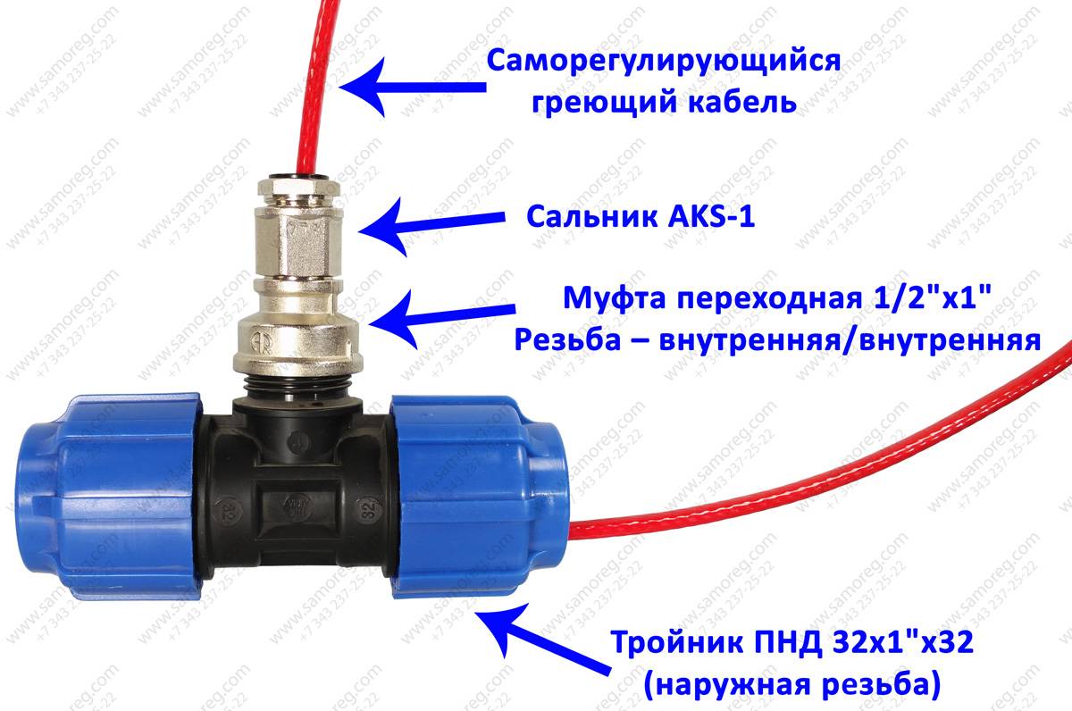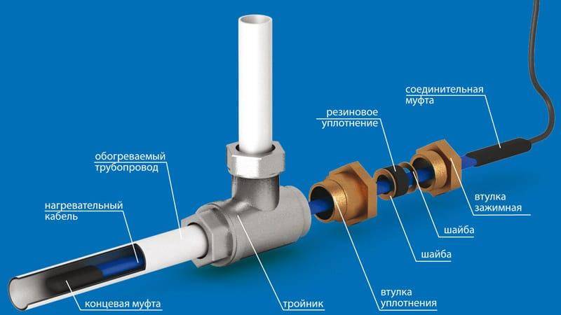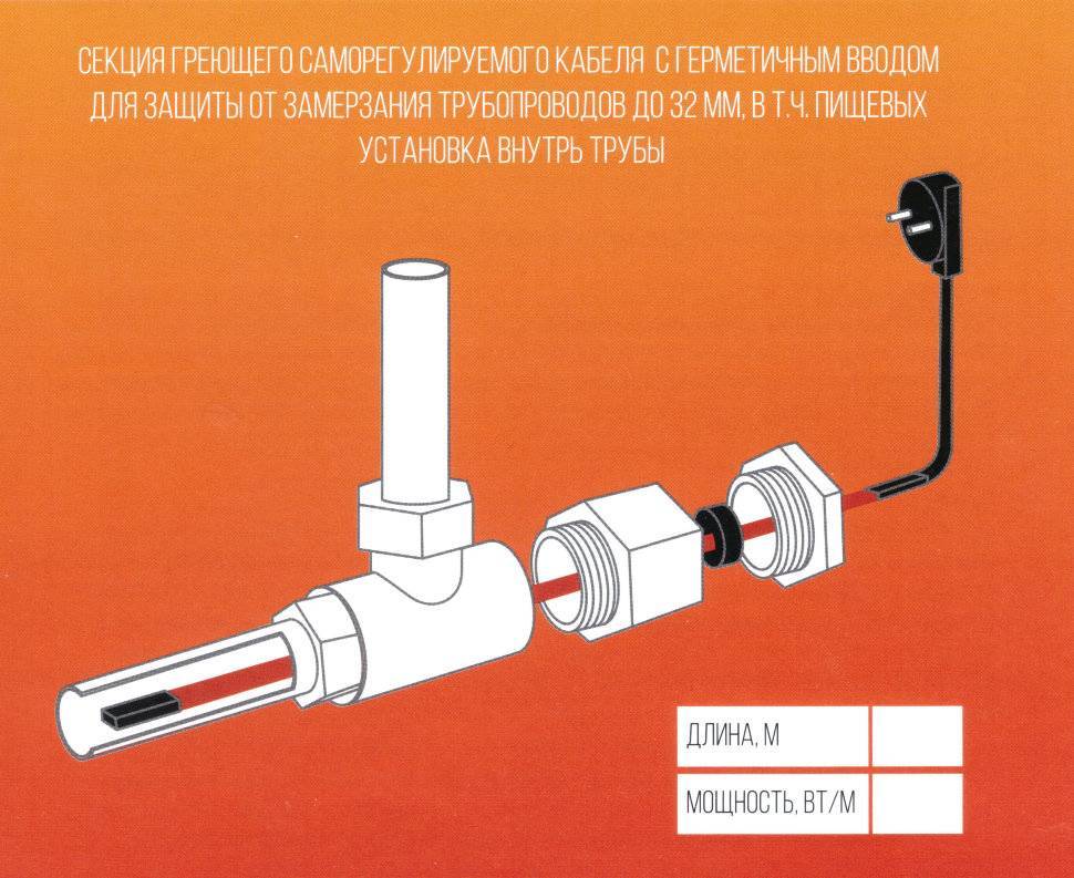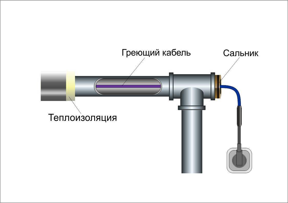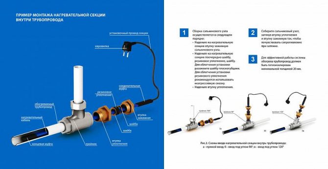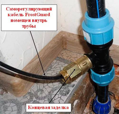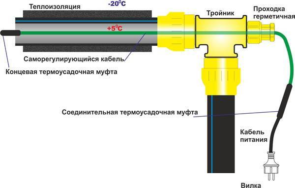 Il est recommandé de confier l'installation d'un câble auto-chauffant à l'intérieur du tuyau à des spécialistes. Le processus consiste à insérer un té à travers lequel le fil est inséré vers l'intérieur à travers le manchon. Dans ce cas, il faut veiller à ce que le revêtement du câble ne soit pas endommagé lors du passage à l'intérieur.