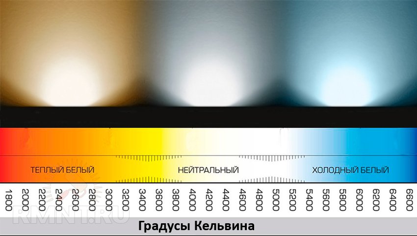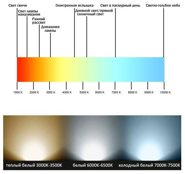 • Température de couleur de lueur, unité K. Détermine la couleur du flux lumineux provenant de la source de rayonnement. Les lampes à incandescence sont pour la plupart de 3000K, c'est une teinte "chaude", jaunâtre.Les sources de lumière LED sont différentes, de 3000K à 6500K (couleur "froide", avec un léger mélange de bleu).