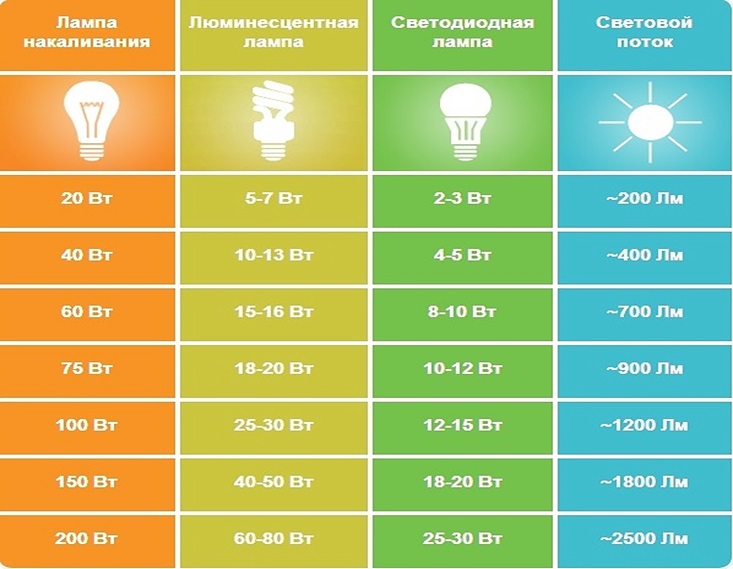 Pour ceux qui n'aiment pas se multiplier, je donnerai un tableau de la dépendance du flux lumineux à la puissance de la lampe pour des appareils de différents types: