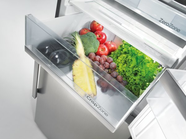 La zone de fraîcheur est présentée dans un seul modèle, mais je vais vous expliquer ce qu'est ce compartiment et pourquoi il est nécessaire. La zone zéro aide à conserver la fraîcheur d'origine des produits grâce à un système de refroidissement séparé. La température à l'intérieur de la zone est maintenue à 0 ° C et vous pouvez régler vous-même l'humidité, créant respectivement un environnement sec ou humide. La première option est optimale pour stocker du poisson frais, de la viande, des yaourts naturels, humides - pour les légumes verts, les salades, les légumes, les fruits.