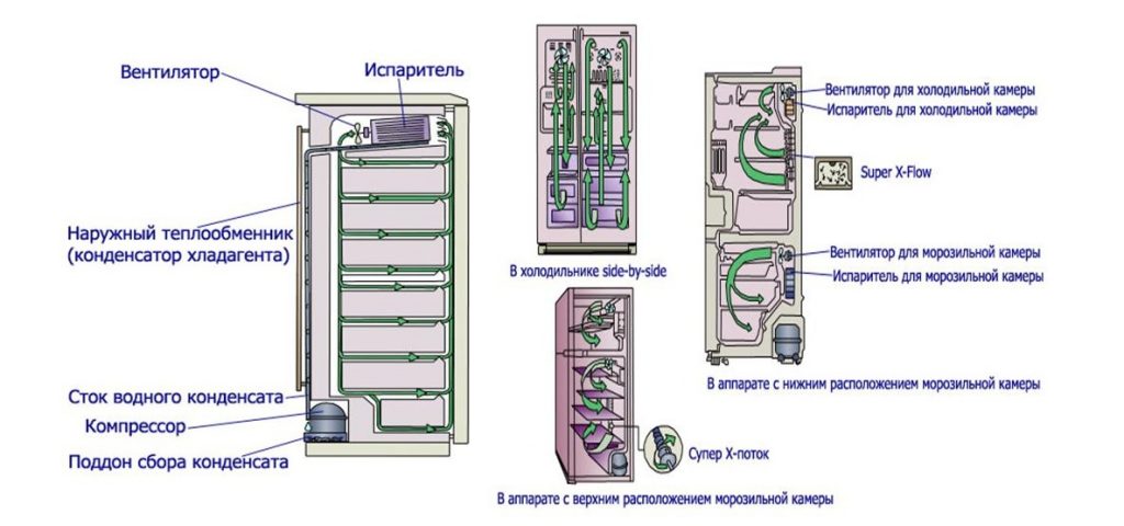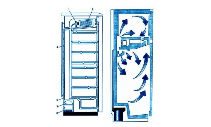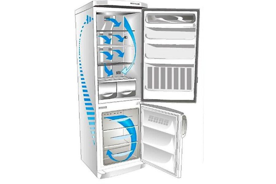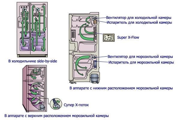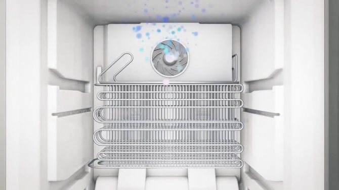 Pour que la technologie fonctionne correctement, il est nécessaire de contrôler la direction des flux d'air. Les ventilateurs contribuent au mouvement uniforme de l'air dans la bonne direction - vers l'évaporateur. La condensation s'y dépose et se transforme en une croûte de glace. En raison de la présence d'un radiateur qui s'allume de temps en temps, la glace ne gèle pas, mais se transforme en eau. Ce liquide s'écoule dans une casserole spéciale, d'où il s'évapore ensuite.