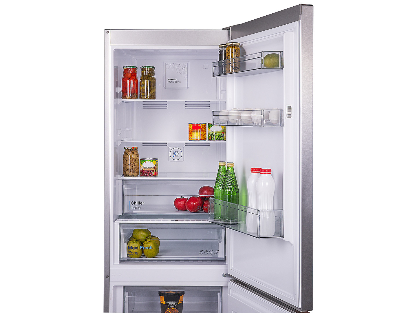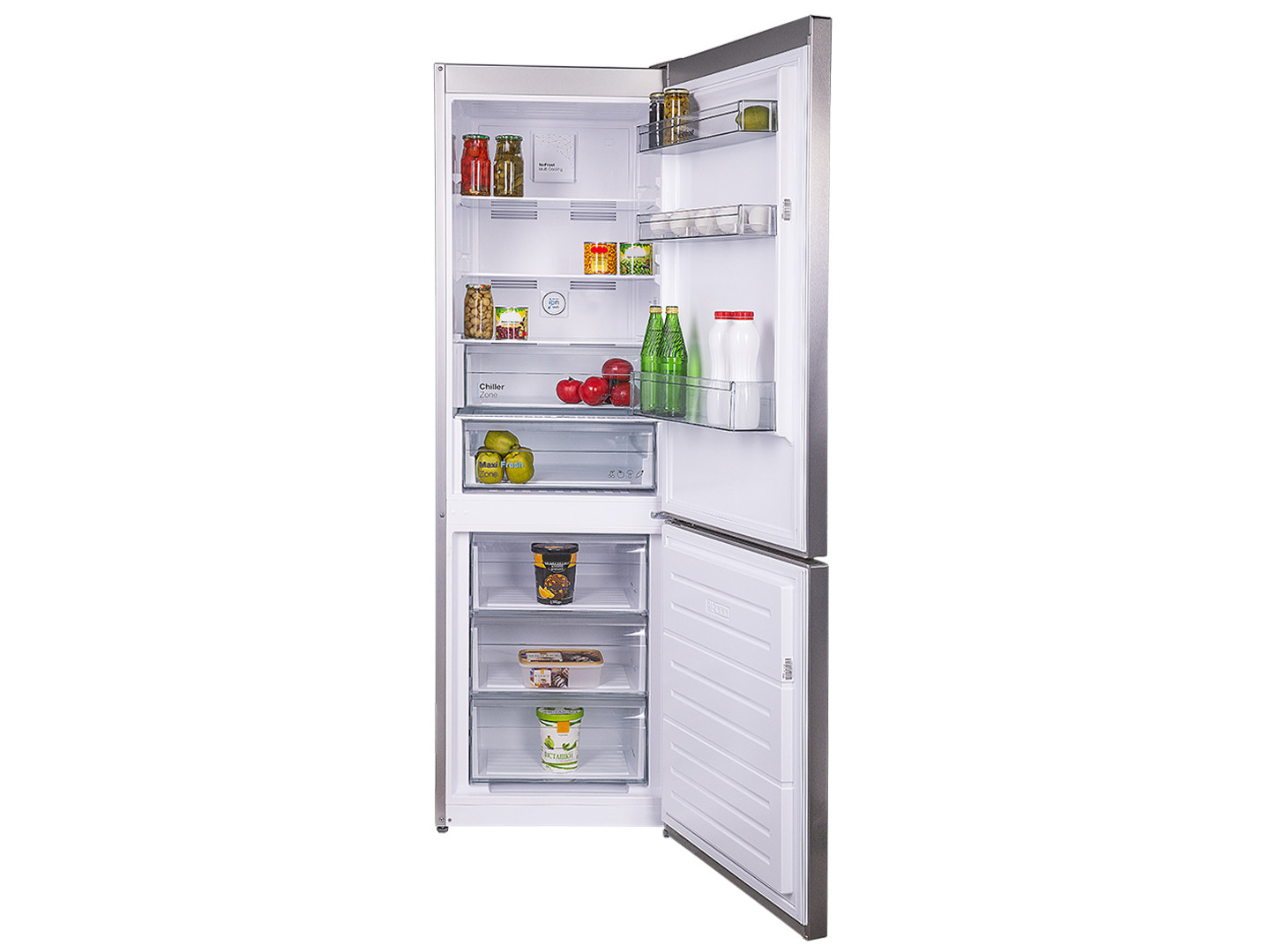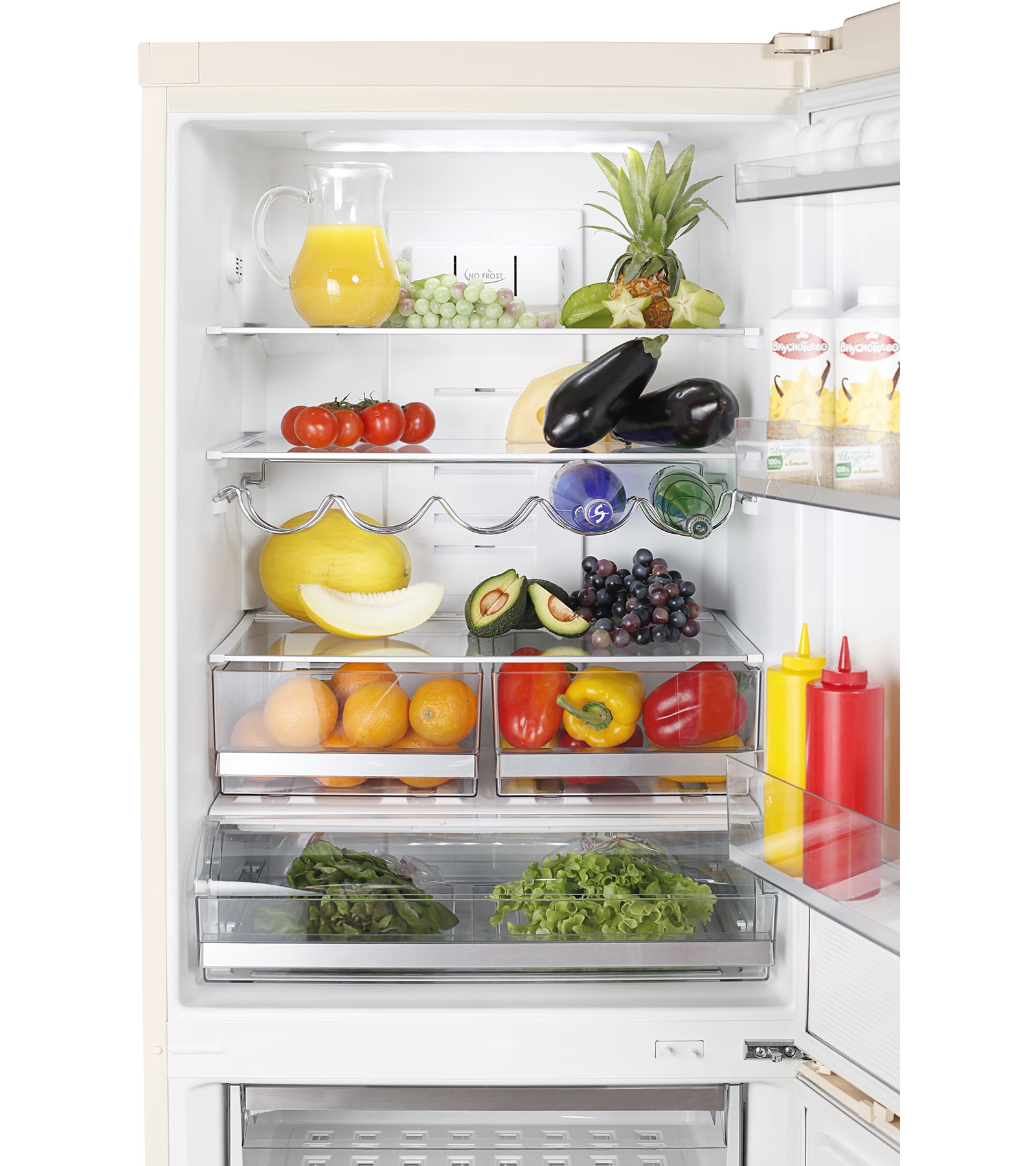 - Plein sans givre. En fait, ce sont deux réfrigérateurs distincts interconnectés.Ils fonctionnent à partir de différents compresseurs, ont leur propre évaporateur, refroidisseur. Le système No Frost dans ce cas fonctionne à la fois dans les compartiments de réfrigération et de congélation.