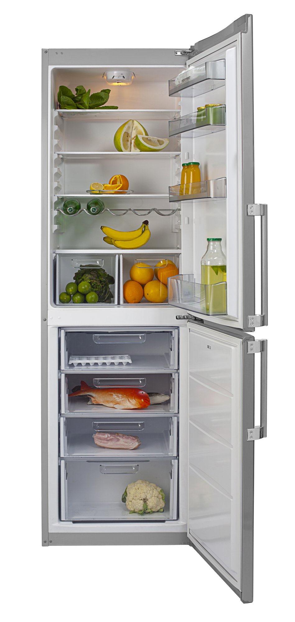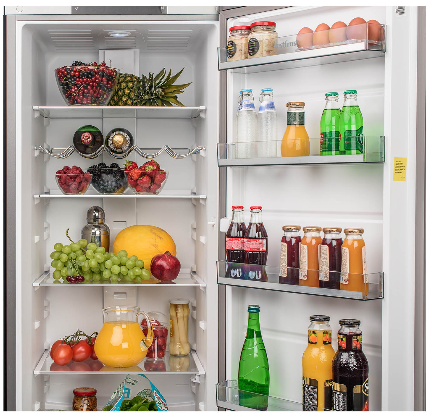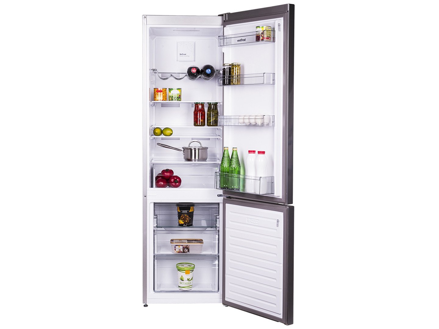 Vestfrost VF 185 est équipé de portes qui, si vous le souhaitez, peuvent être réarrangées de gauche à droite et vice versa. Pour un stockage pratique des produits en petites quantités, il y a des étagères sur les portes avec des plateaux pour le fromage, le beurre et les produits laitiers.